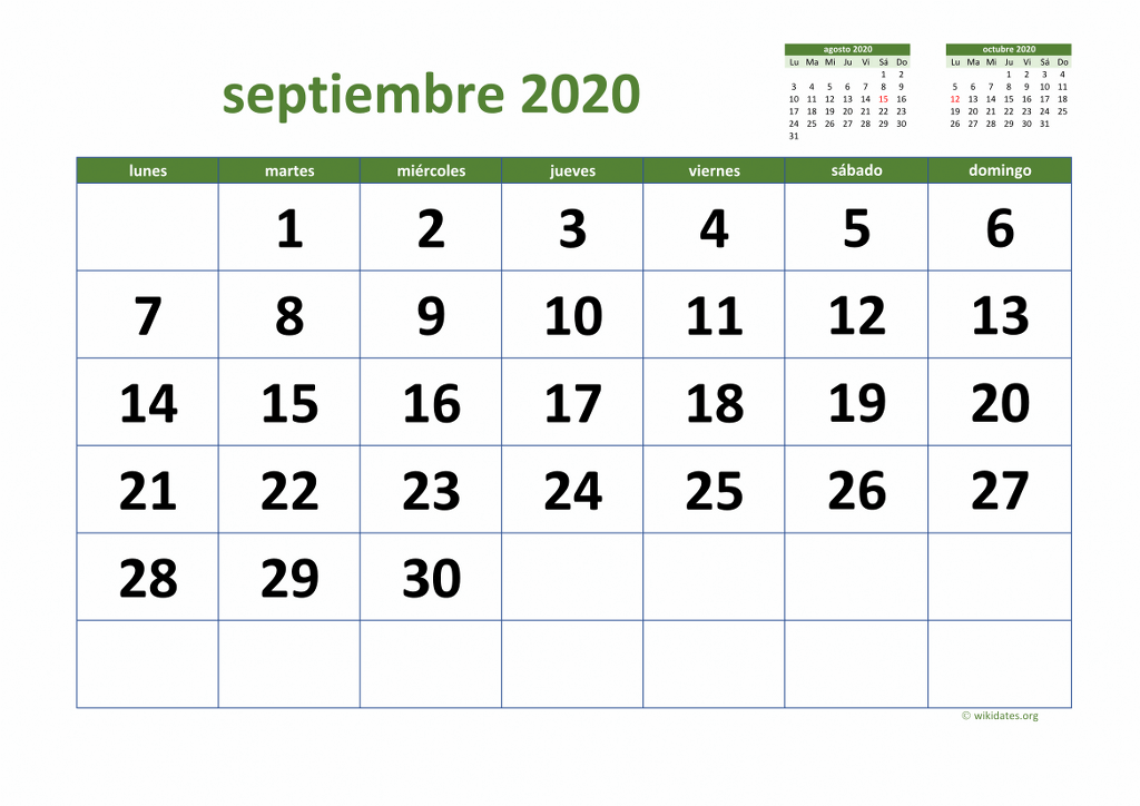 • Descargar Calendario Septiembre 2020 con los días festivos como MS Word, PDF y JPG en formato A4.