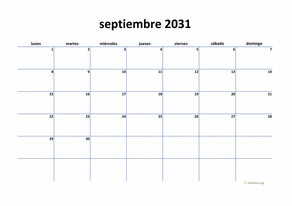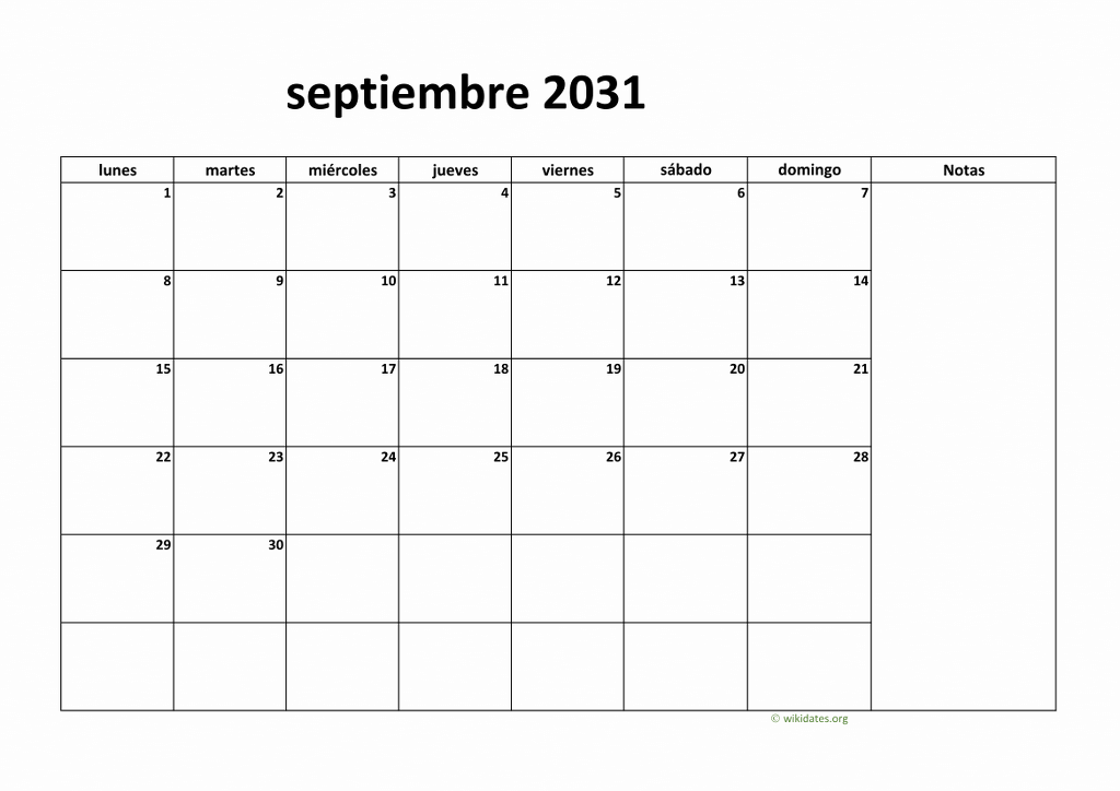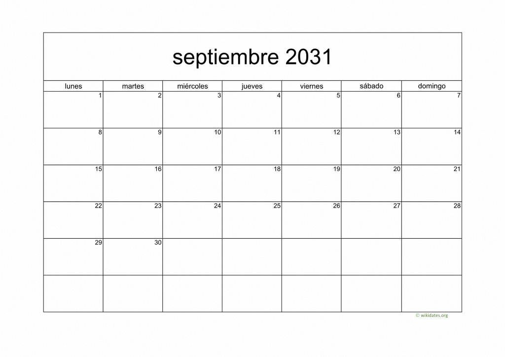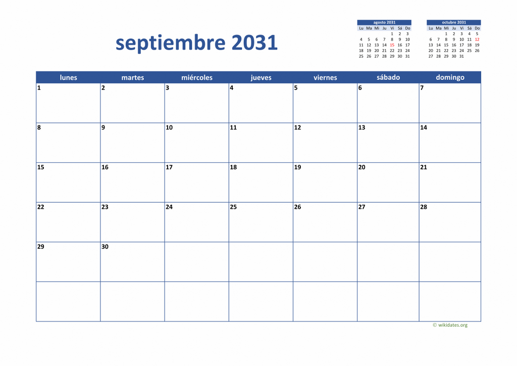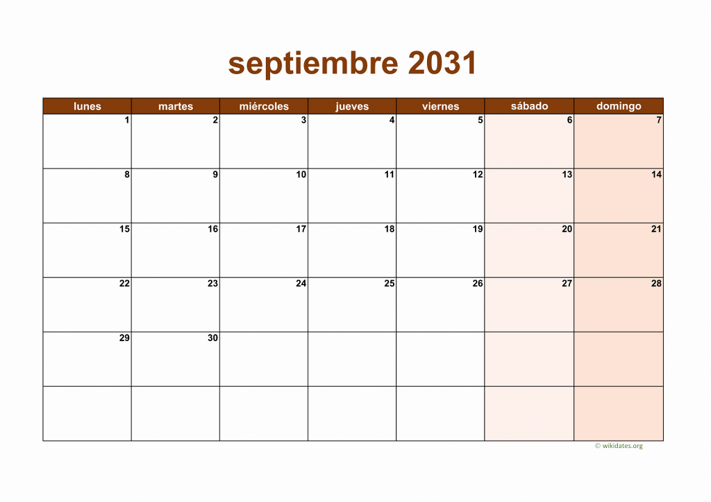 • Calendario Septiembre 2031 con los días festivos, gratis, para imprimir.