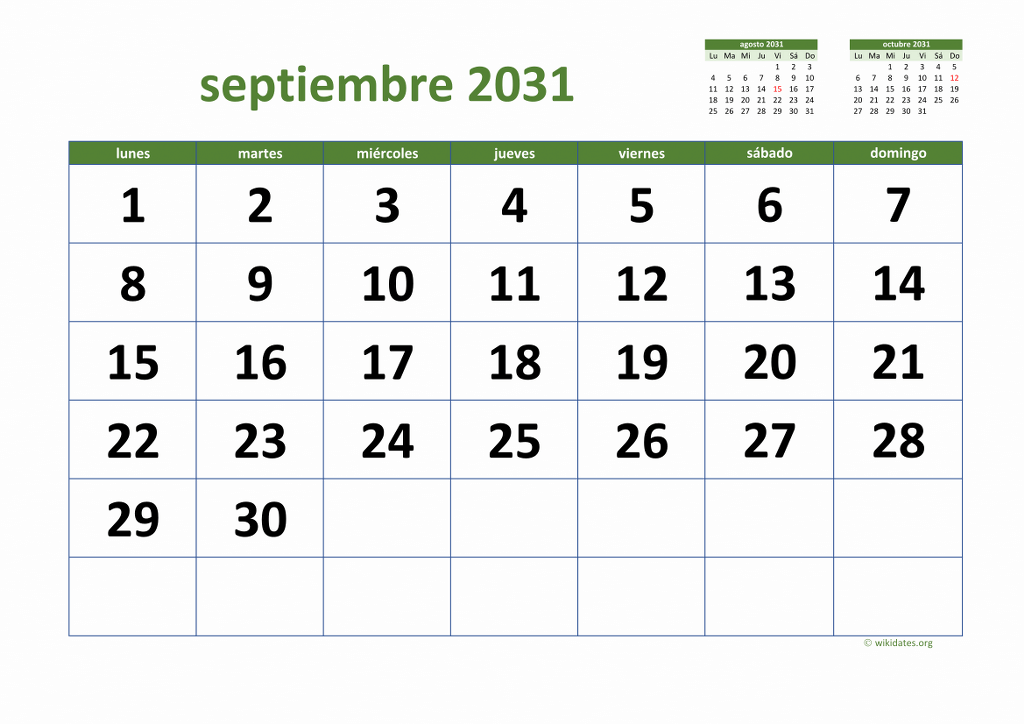 • Descargar Calendario Septiembre 2031 con los días festivos como MS Word, PDF y JPG en formato A4.