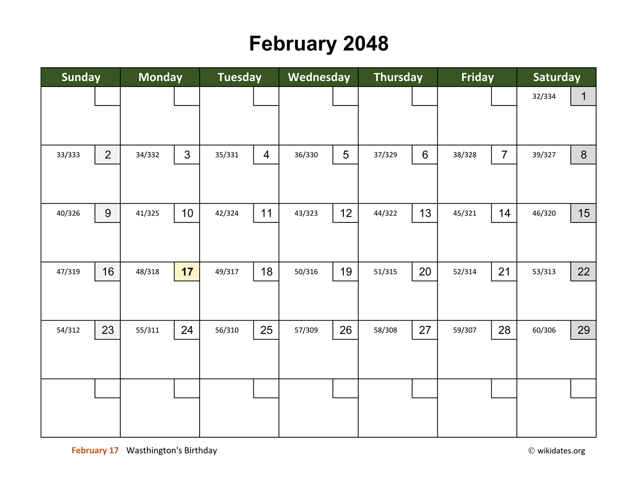 February 2048 calendar with day numbers, including US federal holidays, available in PDF file format, landscape/horizontal orientation, free for print or download.