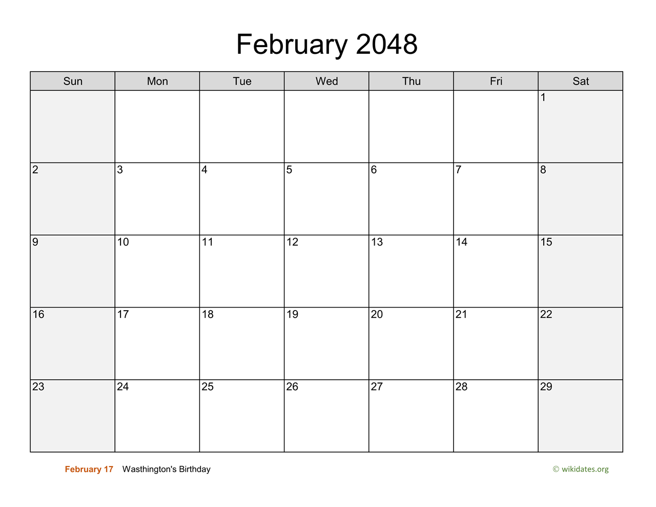 February 2048 Calendar with Saturday and Sunday are shaded in light gray, this template lets you include your schedule, events, notes, to-do list and holidays.