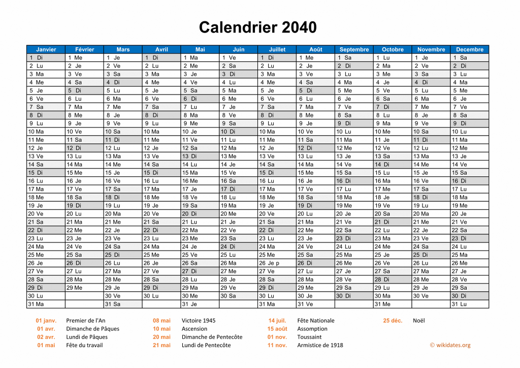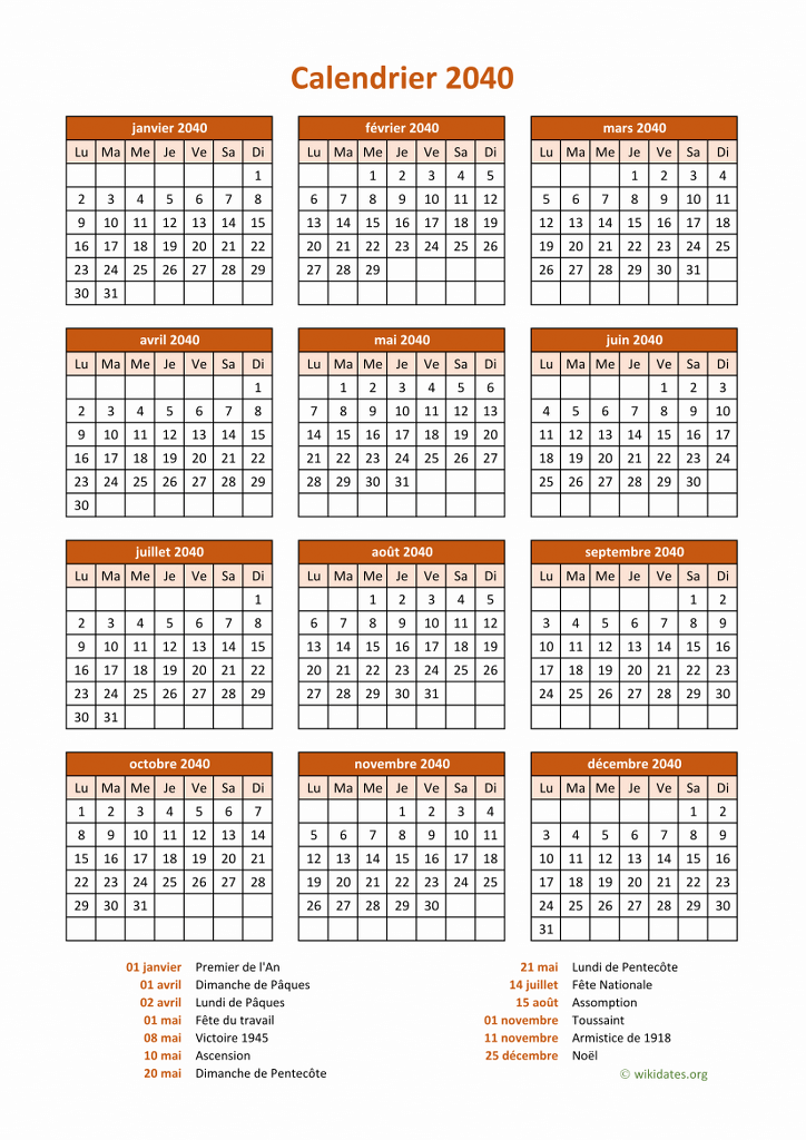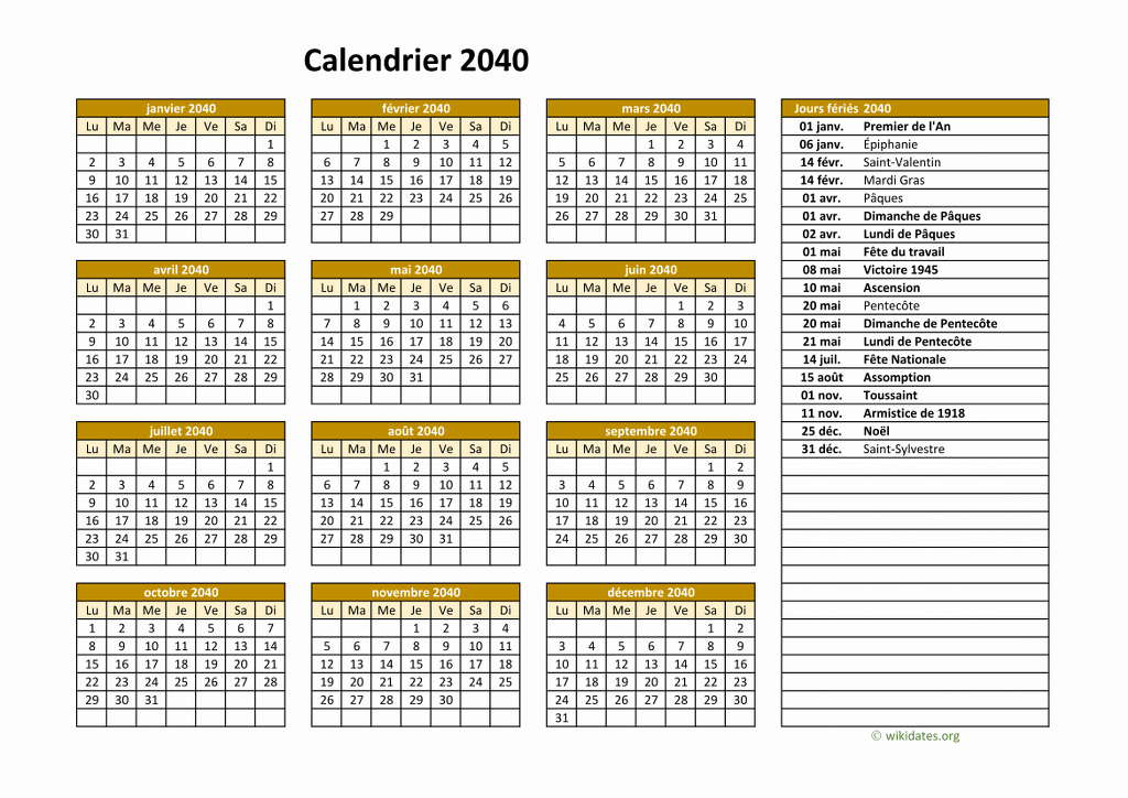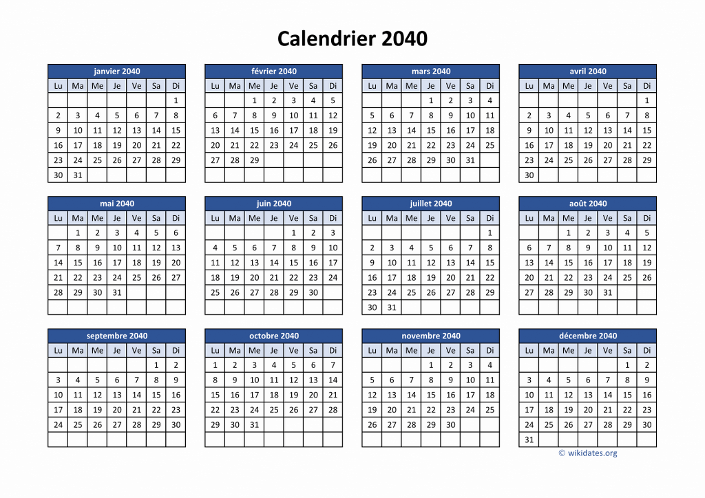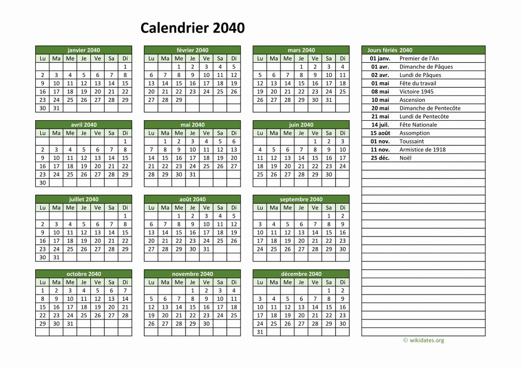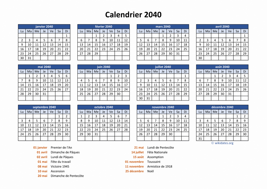 • Calendrier 2040 gratuit avec 12 mois sur une seule page, y compris les jours fériés et le numéro de la semaine.