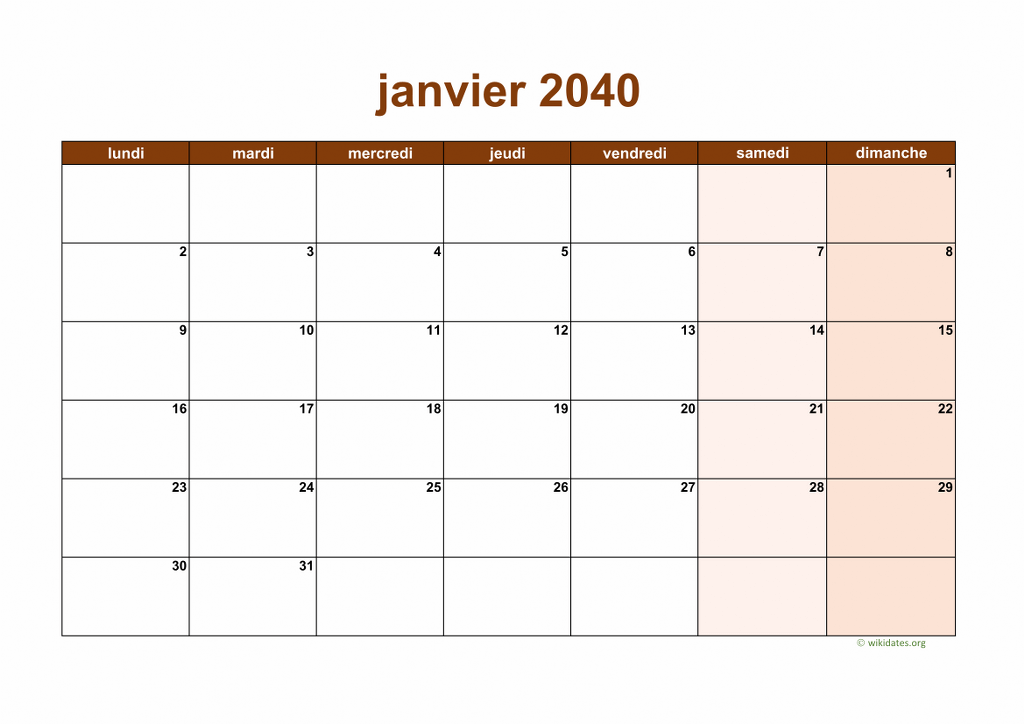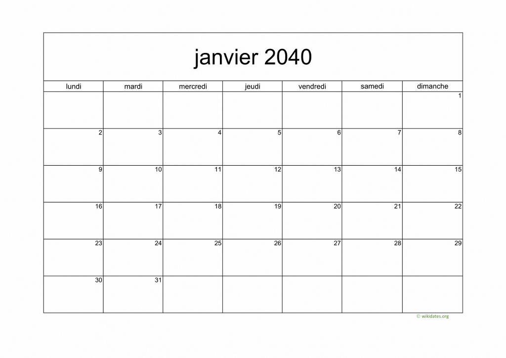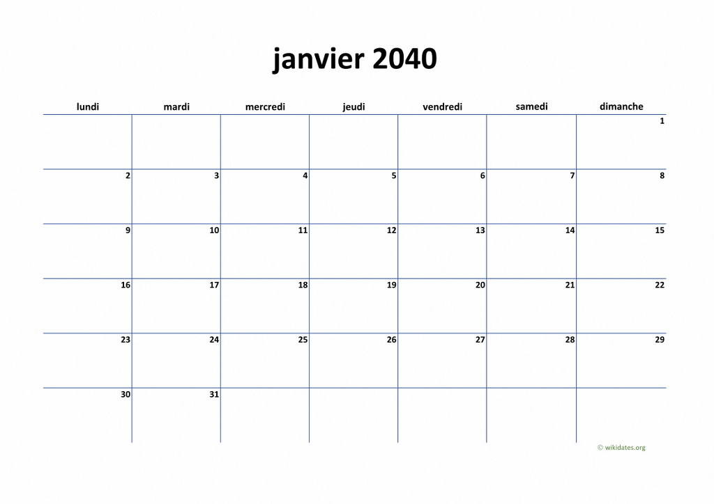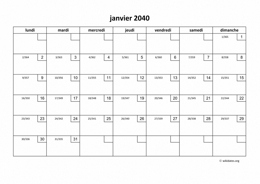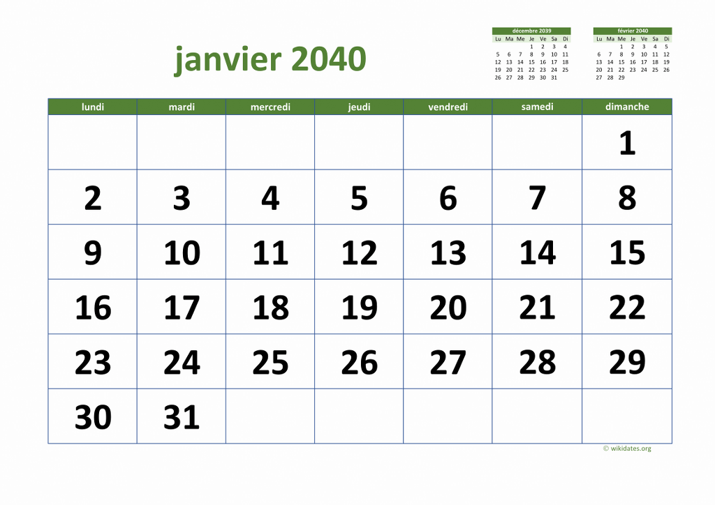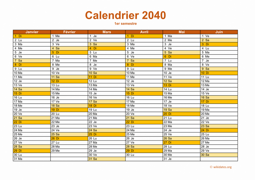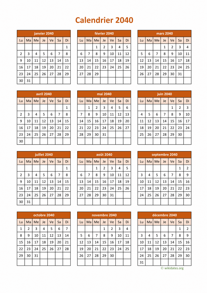 • Calendrier 2040 gratuit avec 12 mois sur une seule page, y compris les jours fériés et le numéro de la semaine.