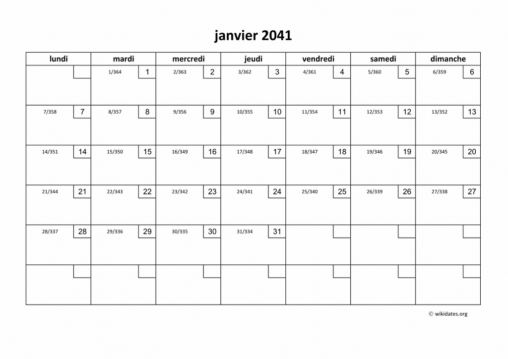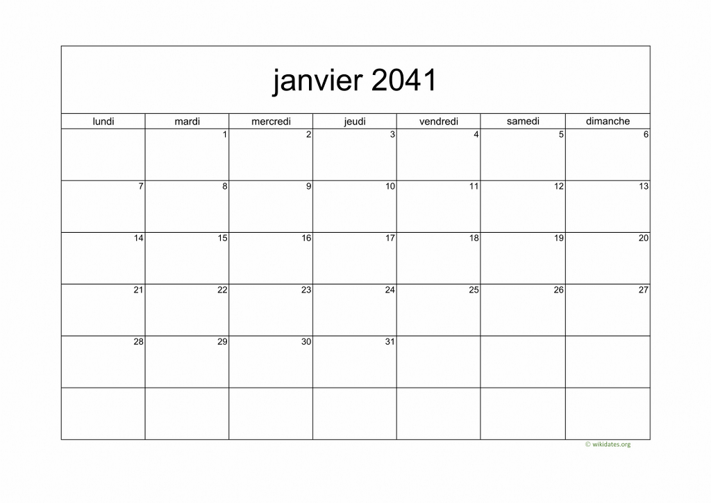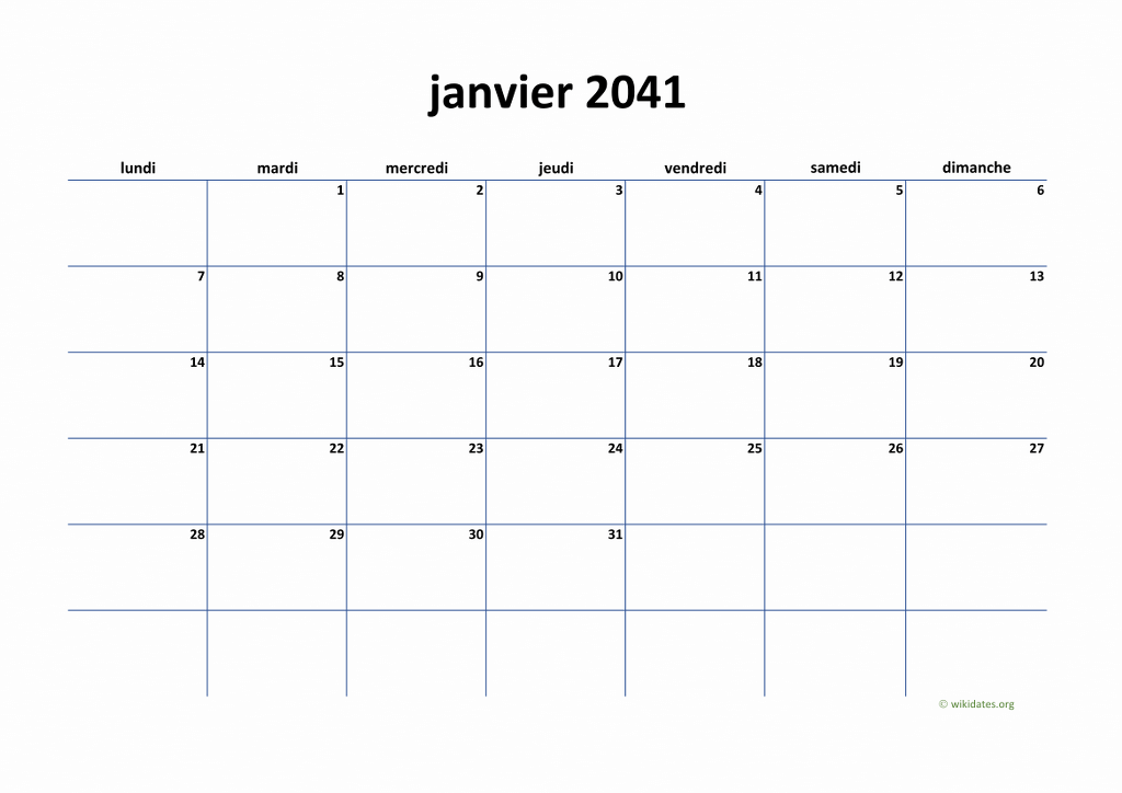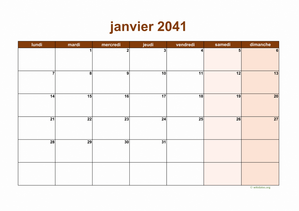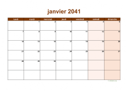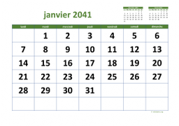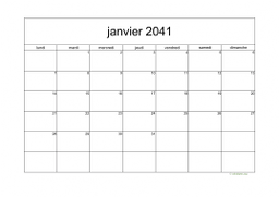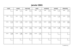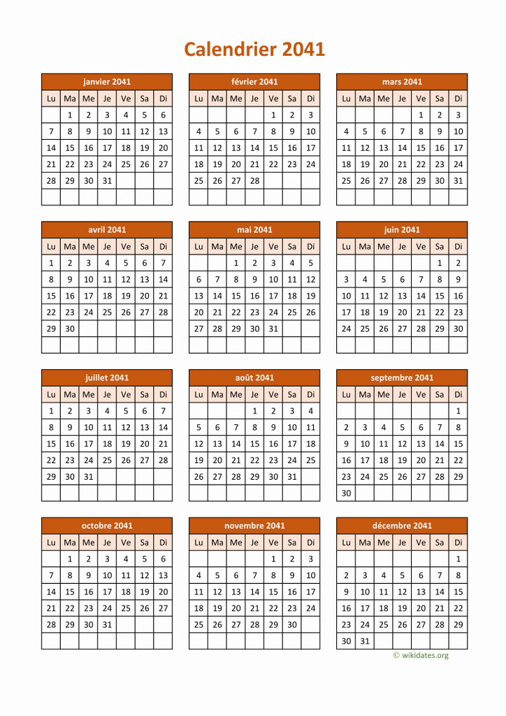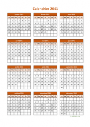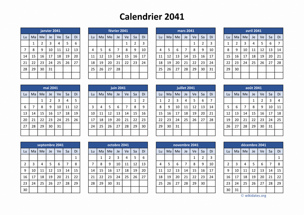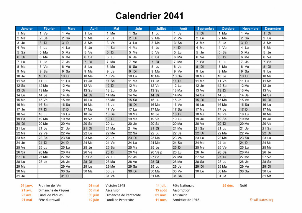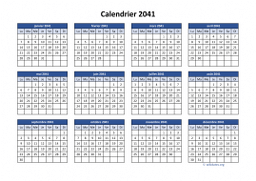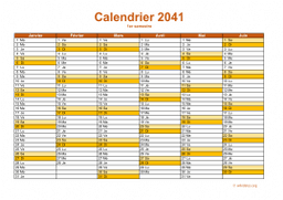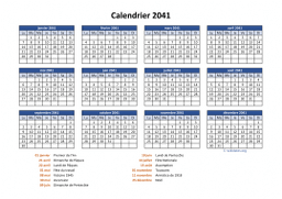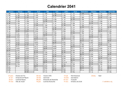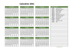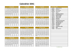 • Calendrier 2041 gratuit avec 12 mois sur une seule page, y compris les jours fériés et le numéro de la semaine.