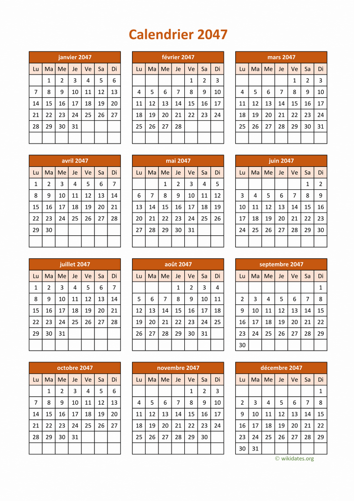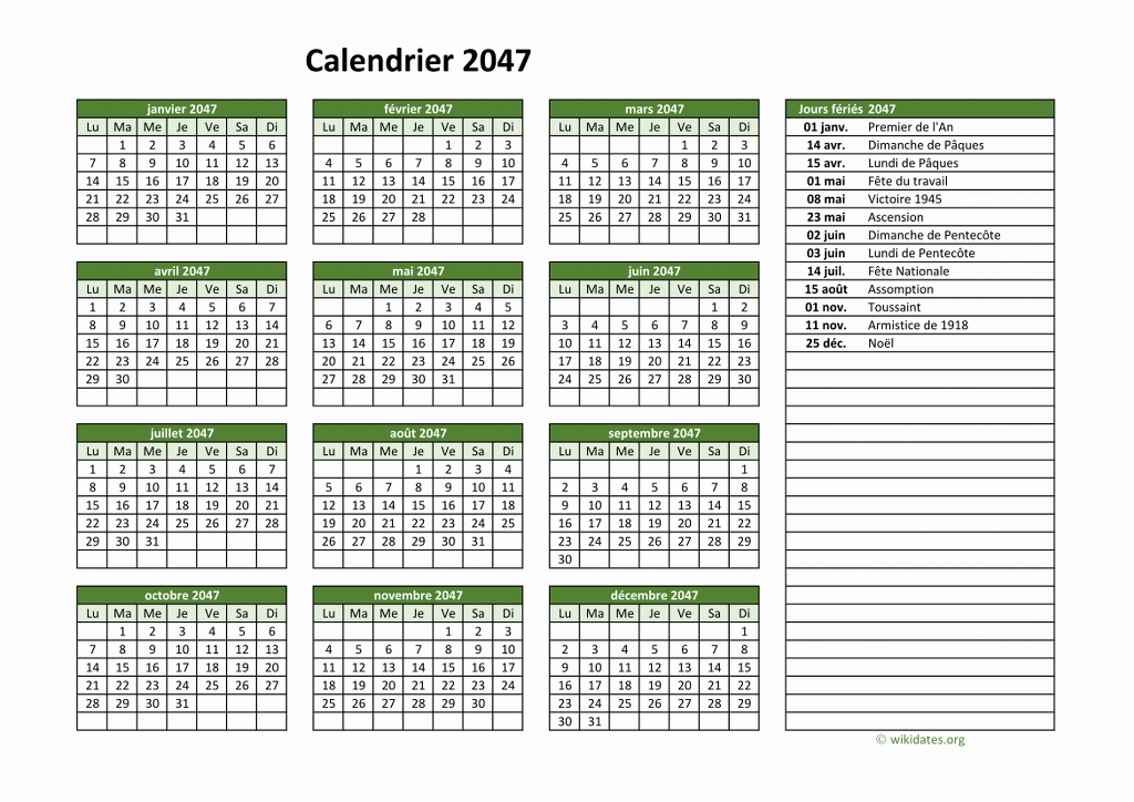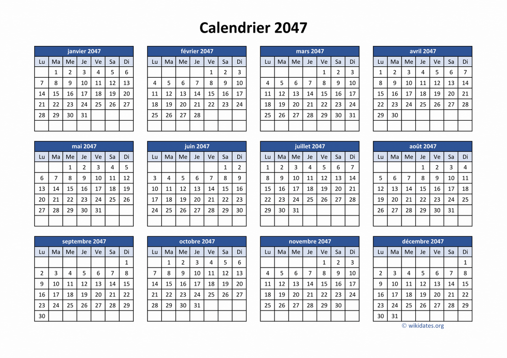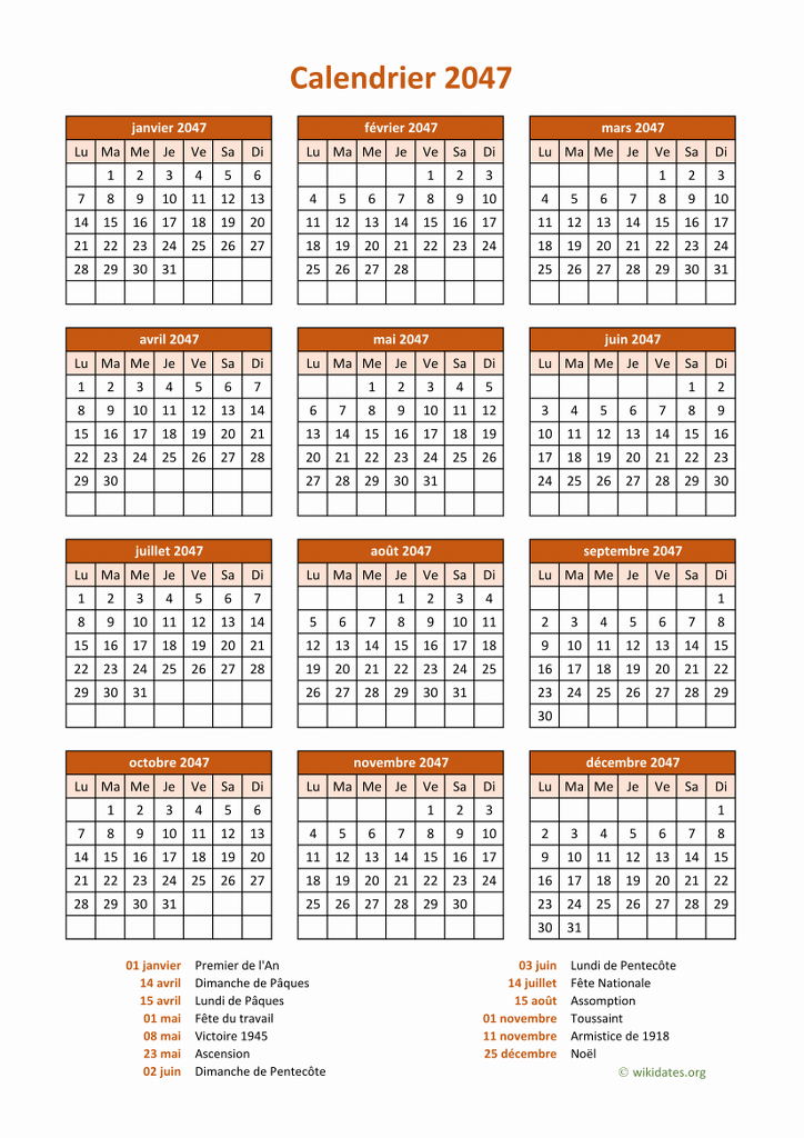 • Calendrier 2047 gratuit avec 12 mois sur une seule page, y compris les jours fériés et le numéro de la semaine.