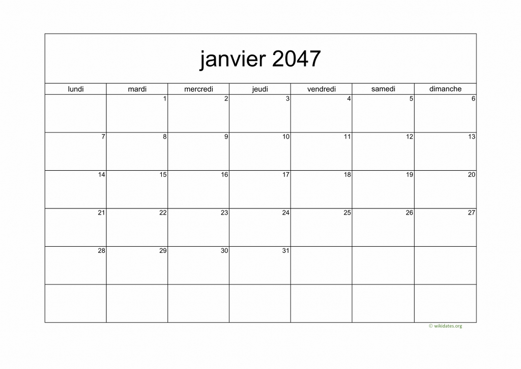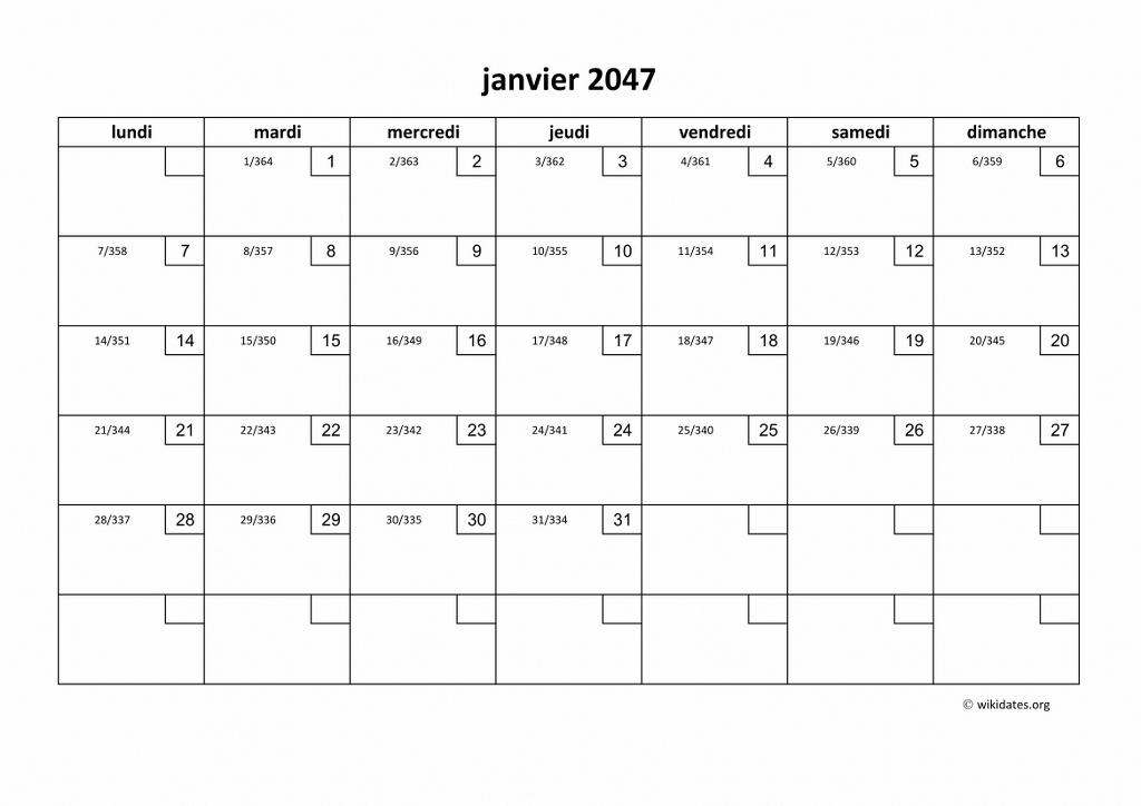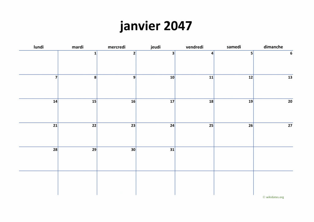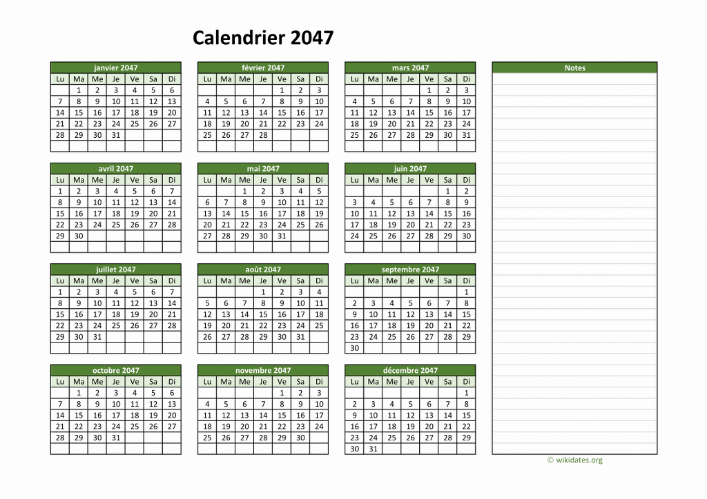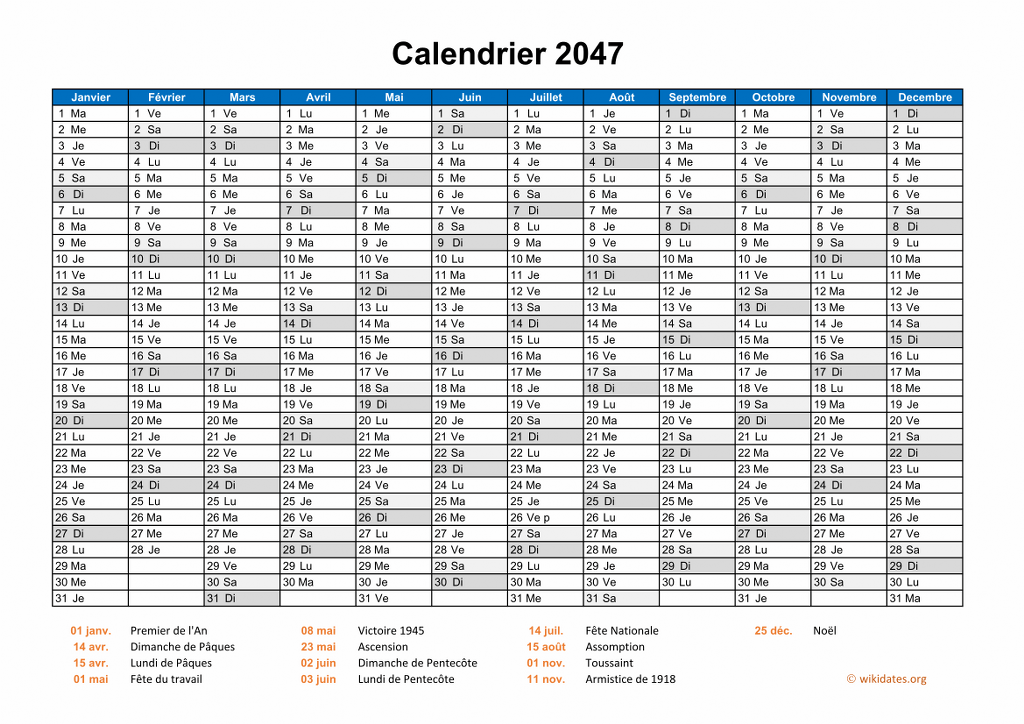 • Calendrier 2047 gratuit avec 12 mois sur une seule page, y compris les jours fériés et le numéro de la semaine.