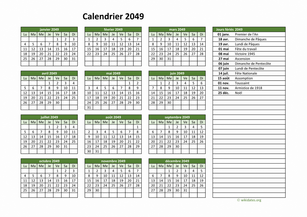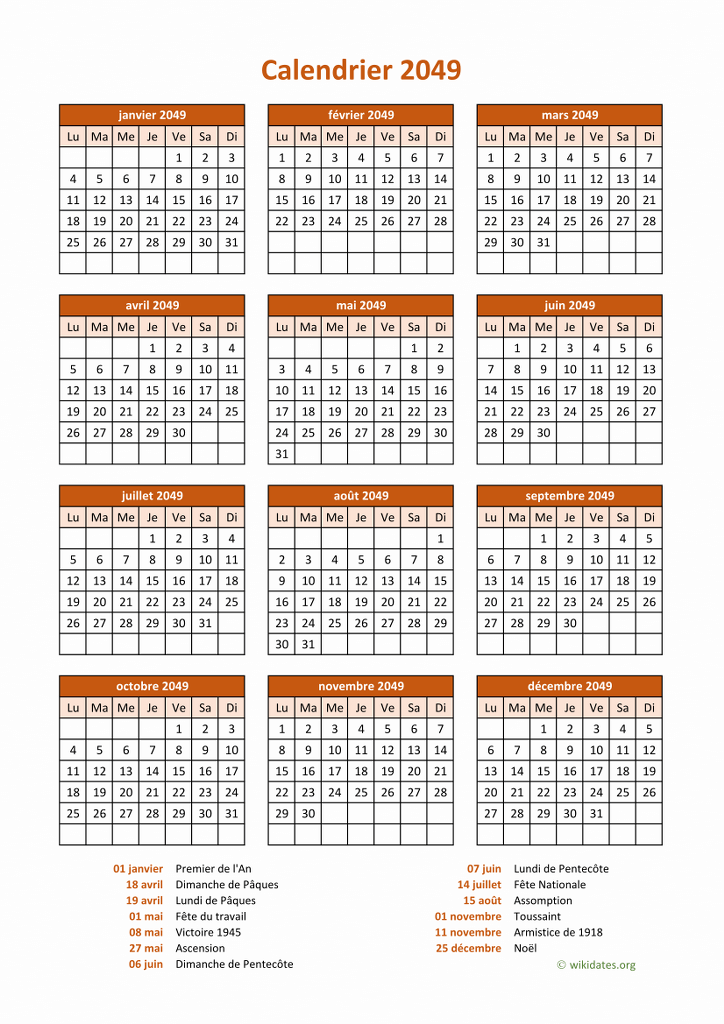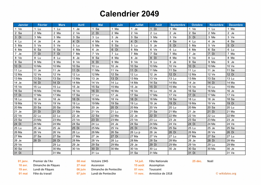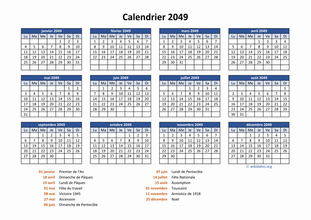 • Calendrier 2049 gratuit avec 12 mois sur une seule page, y compris les jours fériés et le numéro de la semaine.