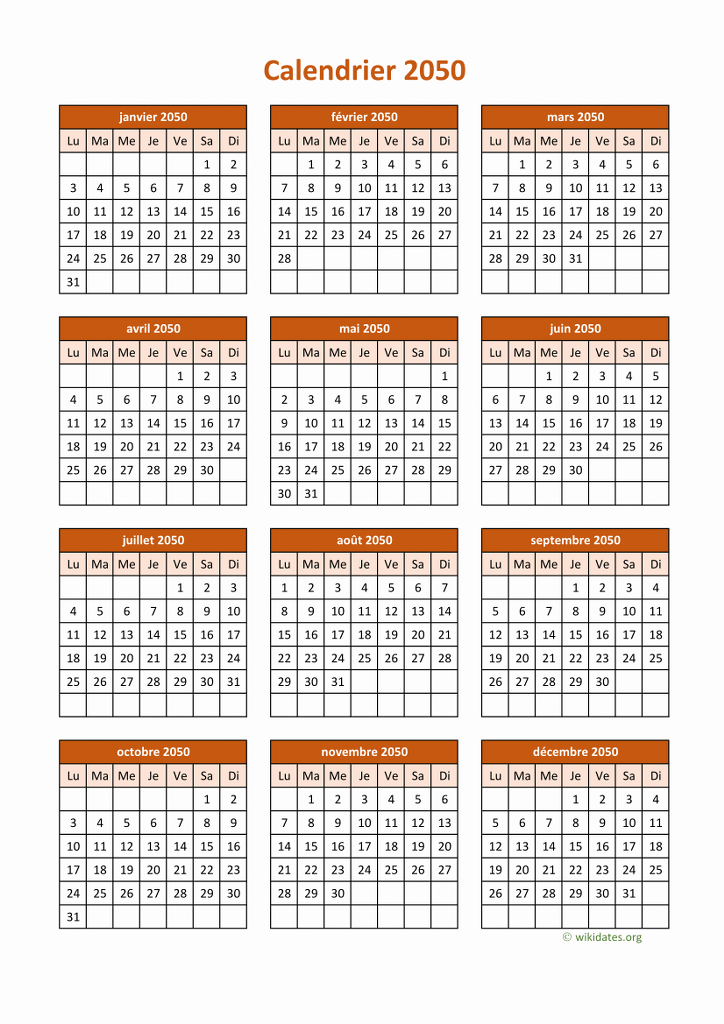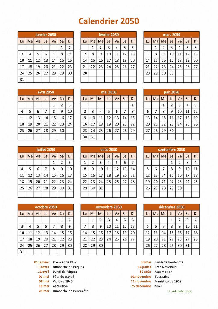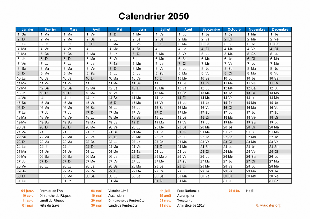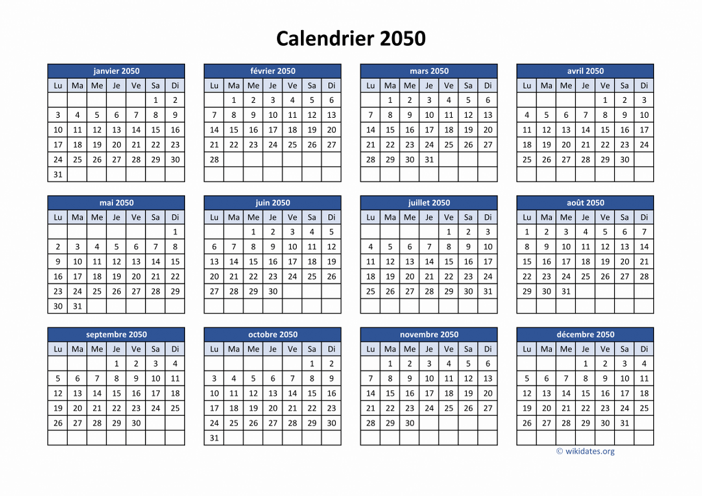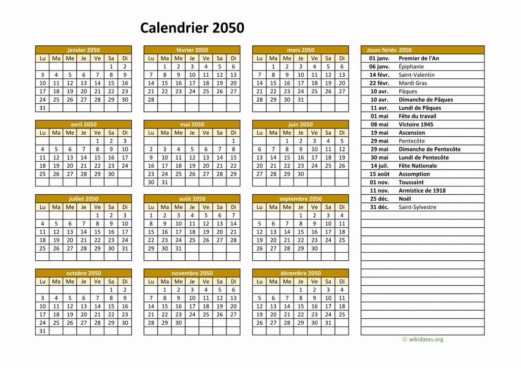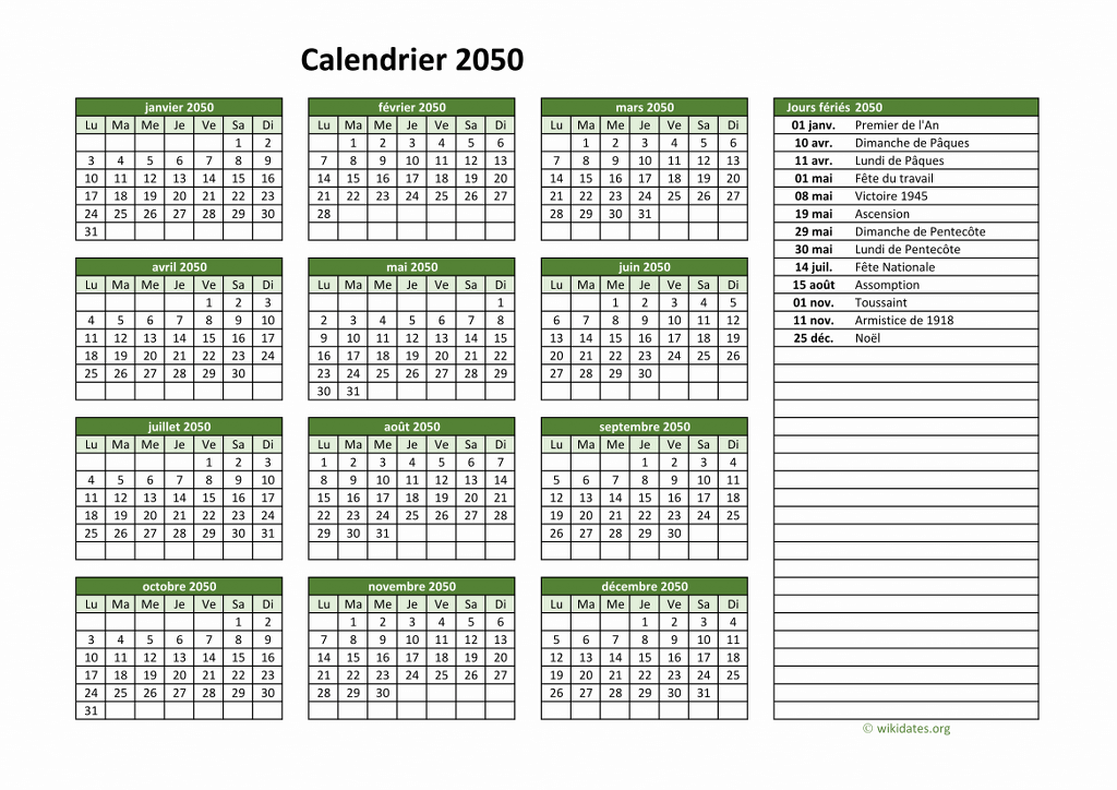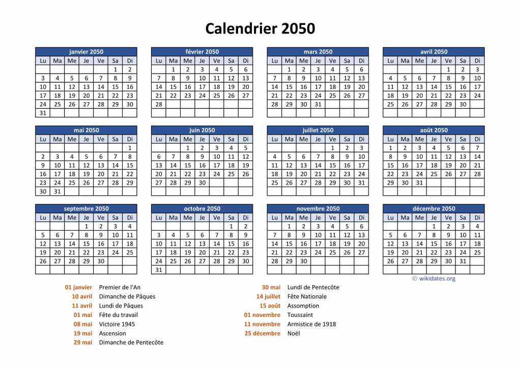 • Calendrier 2050 gratuit avec 12 mois sur une seule page, y compris les jours fériés et le numéro de la semaine.
