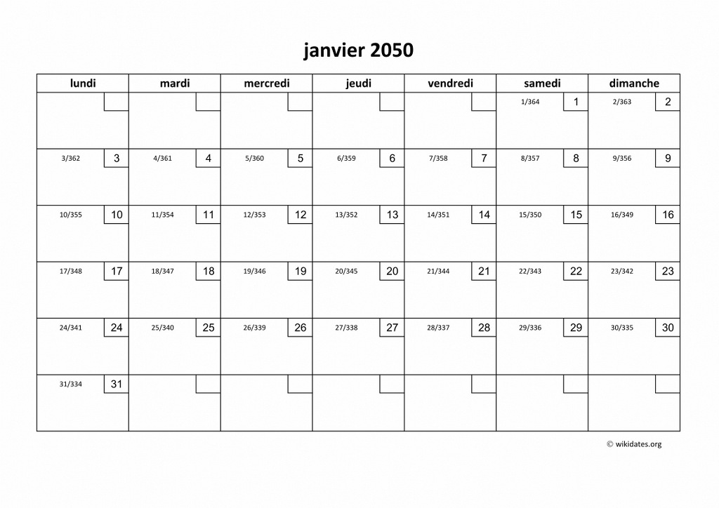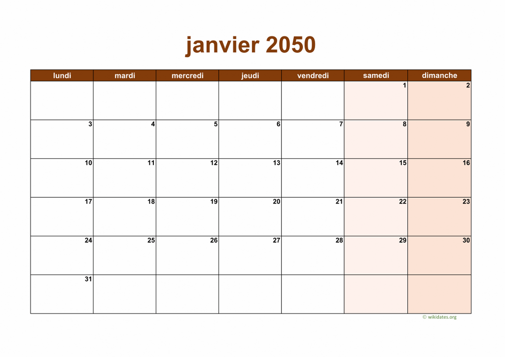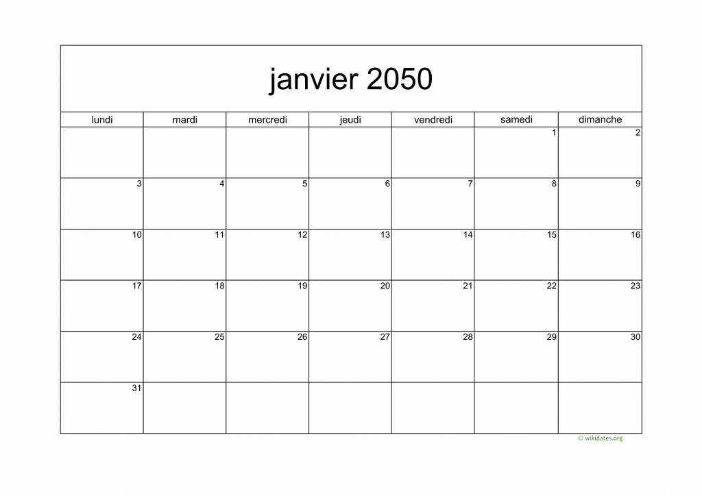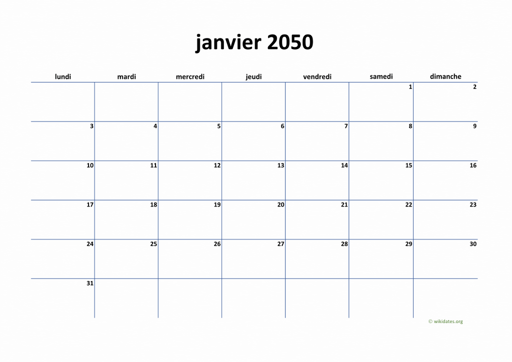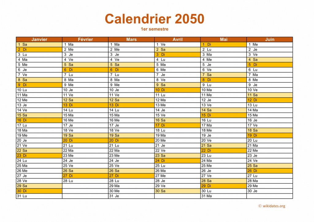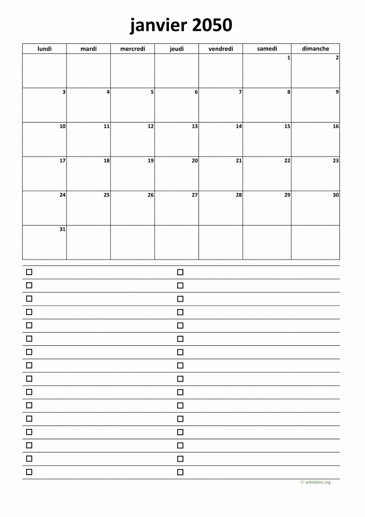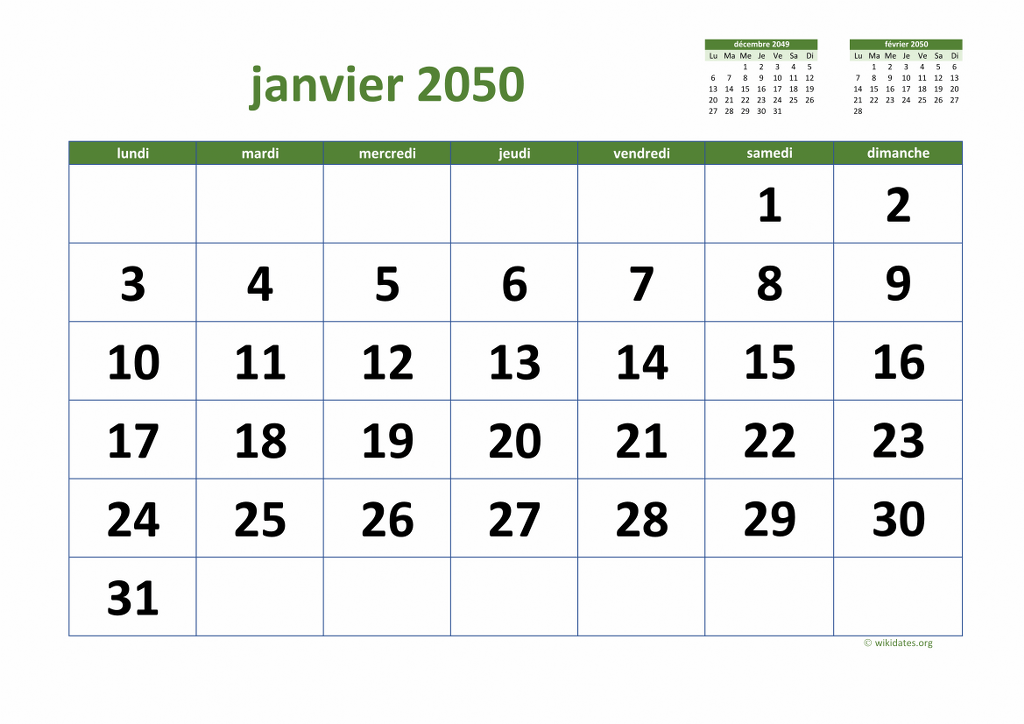 • Calendrier 2050 gratuit avec 12 mois sur une seule page, y compris les jours fériés et le numéro de la semaine.