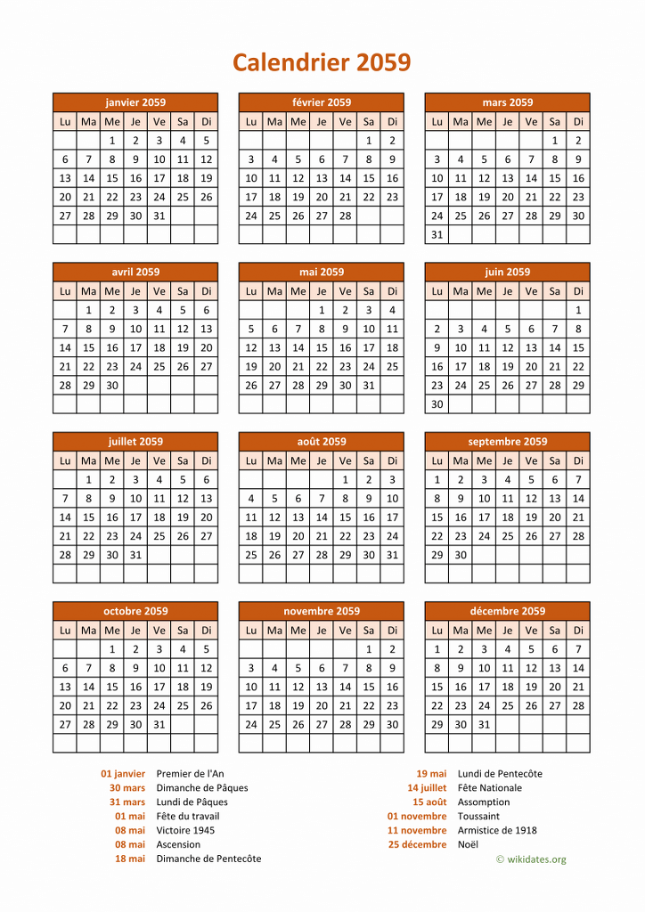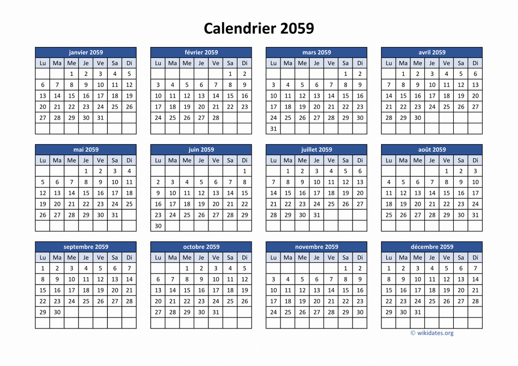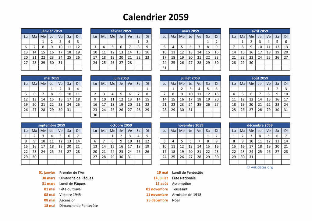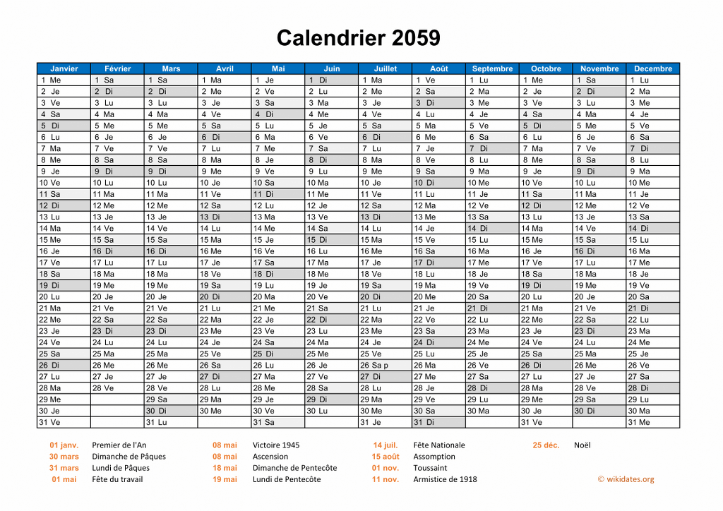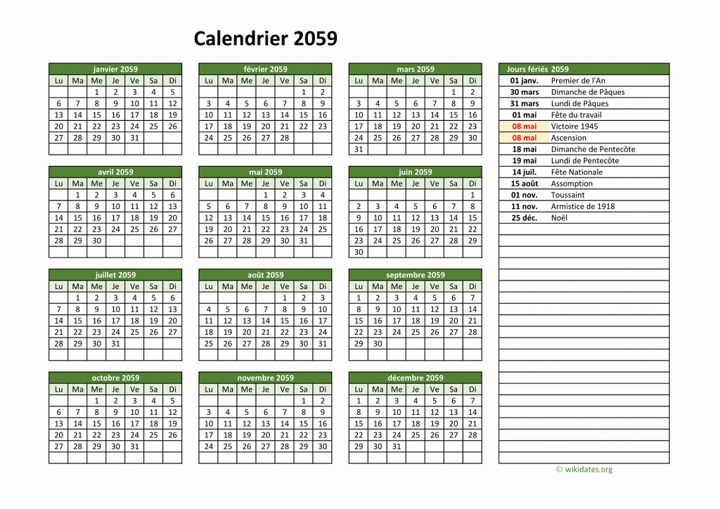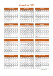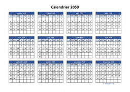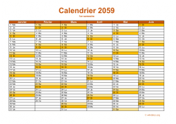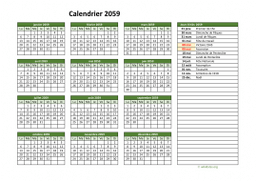 • Calendrier 2059 gratuit avec 12 mois sur une seule page, y compris les jours fériés et le numéro de la semaine.