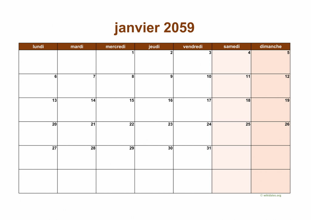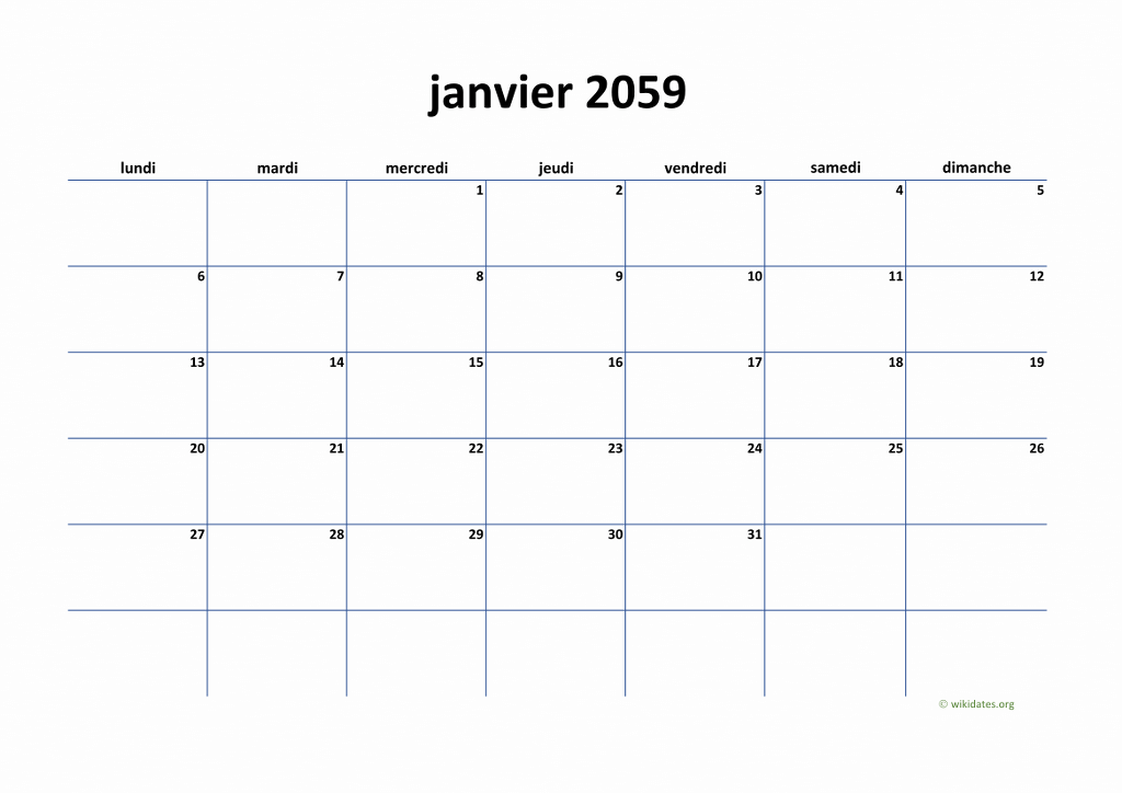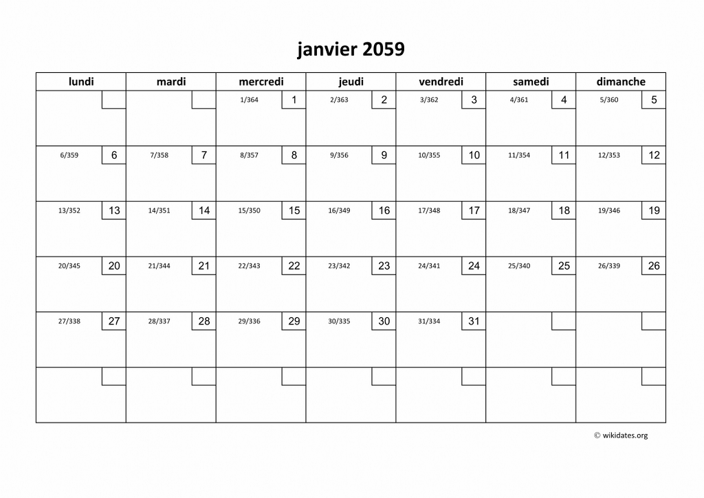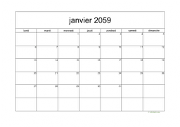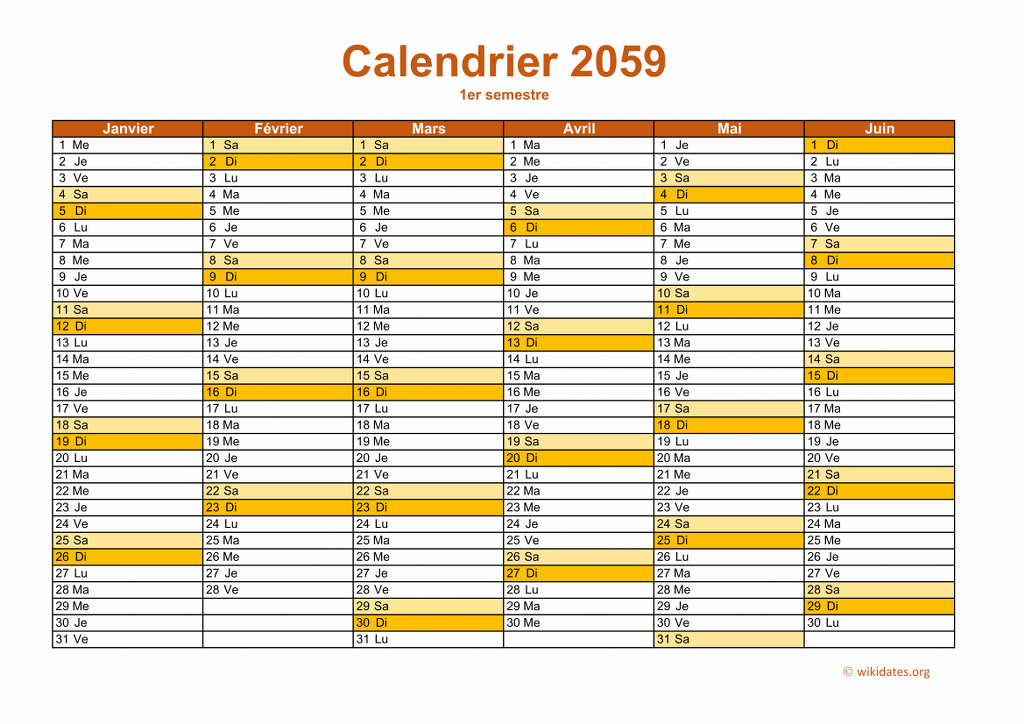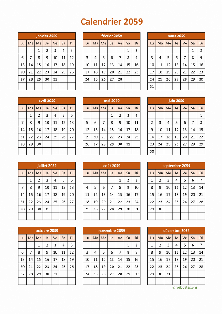 • Calendrier 2059 gratuit avec 12 mois sur une seule page, y compris les jours fériés et le numéro de la semaine.