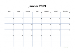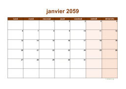 • Calendrier mensuel 2059 avec 12 mois sur 12 pages (un mois par page), y compris les jours fériés et le numéro de la semaine (semaine commence le dimanche ou le lundi).