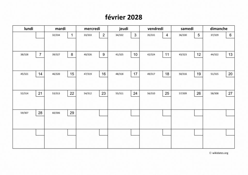 • Télécharger Calendrier Février 2028 avec les vacances et le numéro de la semaine comme MS Word, PDF et JPEG (format d'image) en format papier A4.