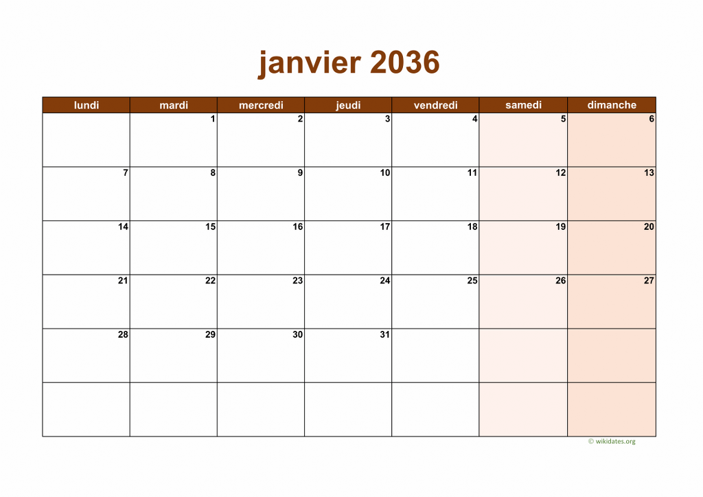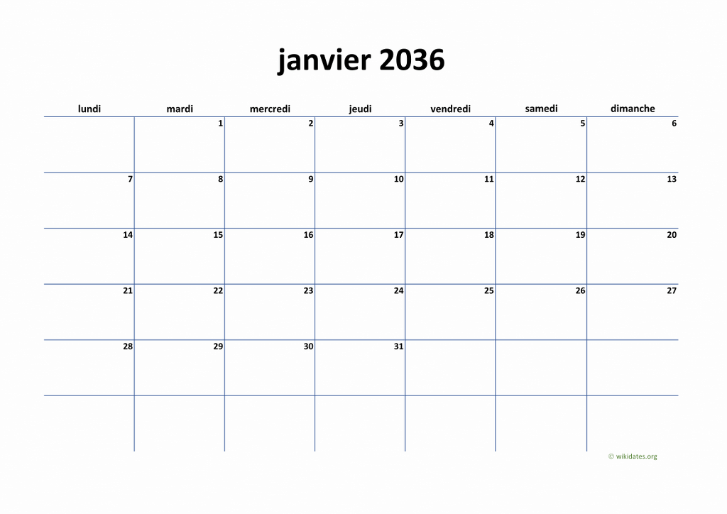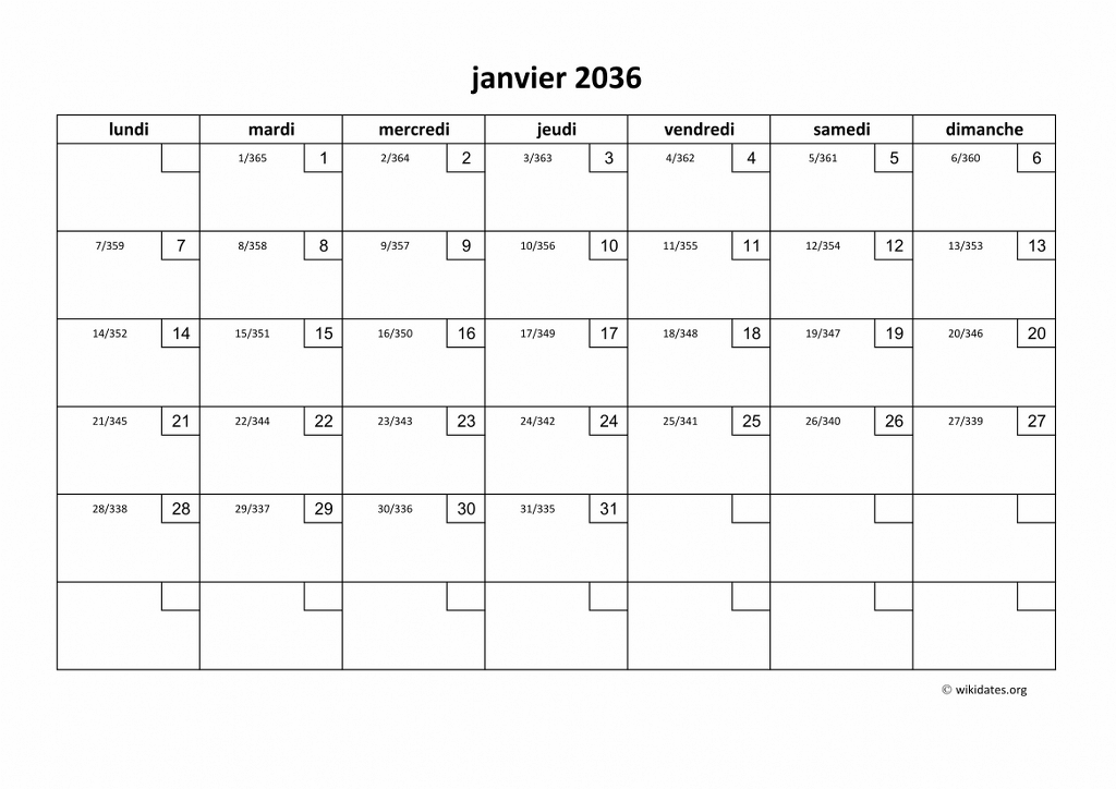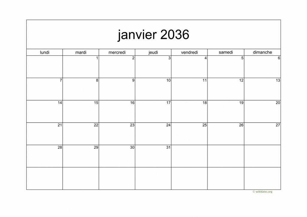 Calendrier janvier 2036 gratuit