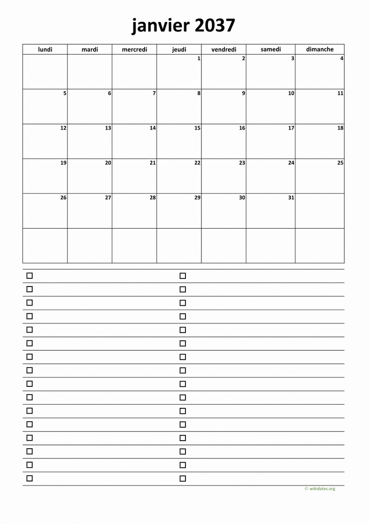 • Allez sur cette page pour télécharger le calendrier annuel 2037, 12 mois sur une page (semaine commence le lundi).