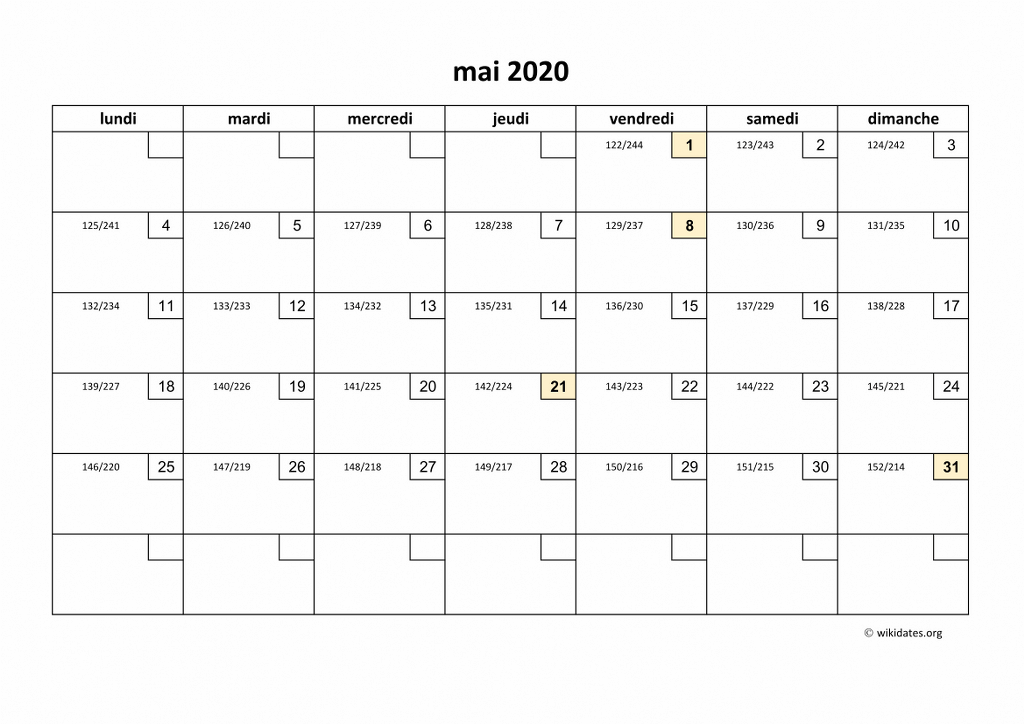 • Télécharger Calendrier Mai 2020 avec les vacances et le numéro de la semaine comme MS Word, PDF et JPEG (format d'image) en format papier A4.