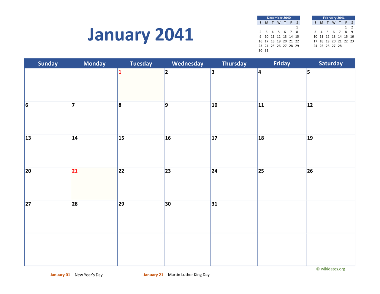 January 2041 calendar classic design with a view of the previous and next months, including federal holidays, letter paper size, week starts on Sunday, landscape/horizontal format.