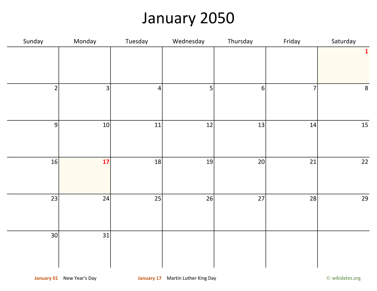 January 2050 Calendar with Bigger boxes make it easier to write in and scan your schedule. You can print full-page calendar with US holidays, week starts on Sunday, landscape/horizontal orientation.