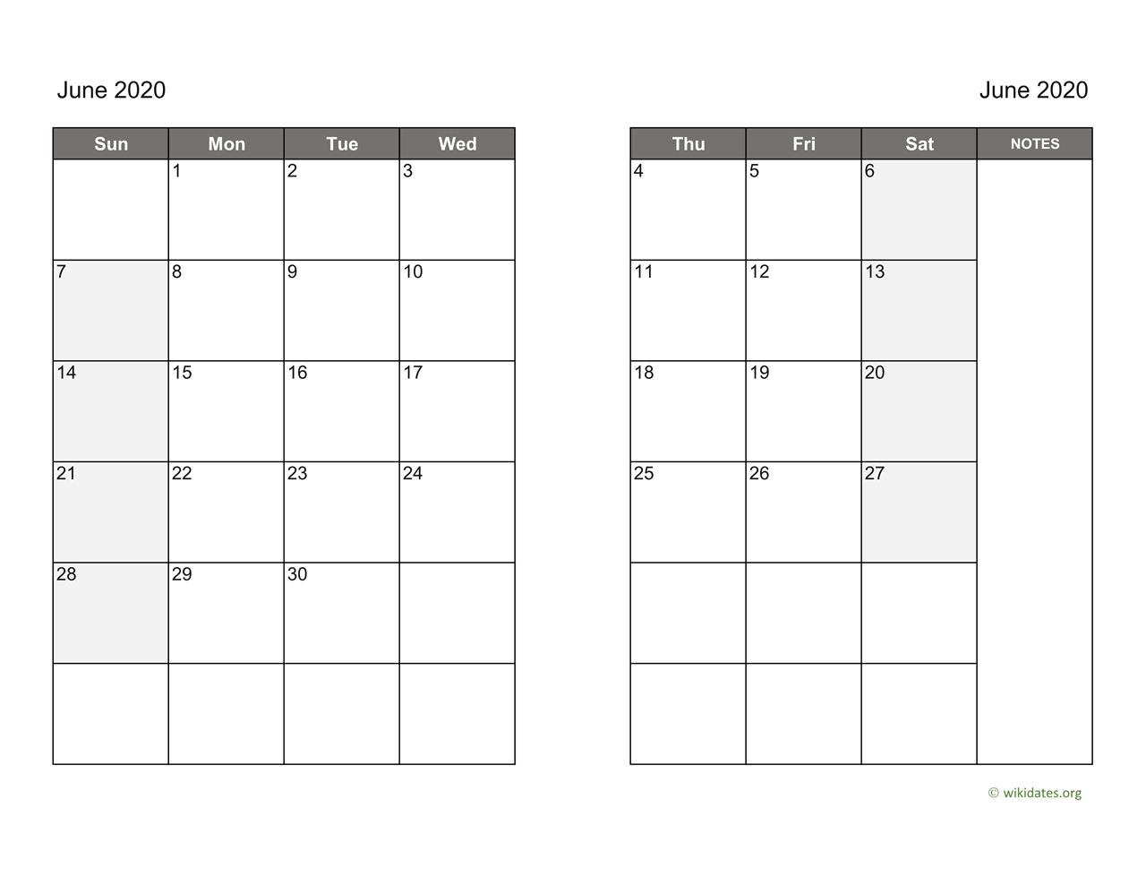 June 2020 Calendar spread across two pages and a column for notes. This calendar template lets you create calendar for june 2020 split across 2 pages with your schedule, events, notes and holidays included, download or print double-sided refills for your planner/organizer.