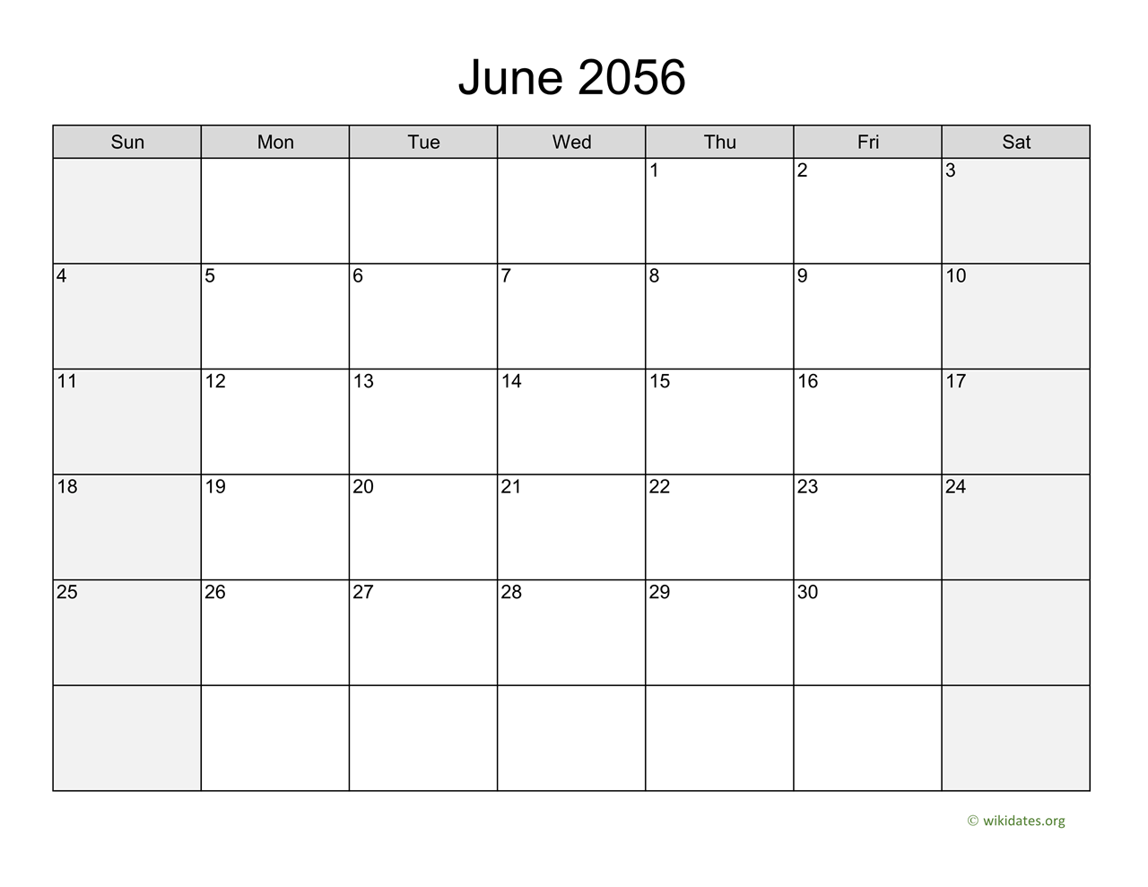 June 2056 Calendar with Saturday and Sunday are shaded in light gray, this template lets you include your schedule, events, notes, to-do list and holidays.