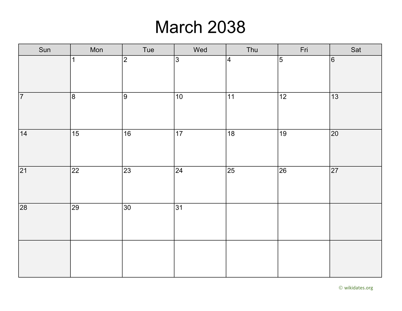 March 2038 Calendar with Saturday and Sunday are shaded in light gray, this template lets you include your schedule, events, notes, to-do list and holidays.