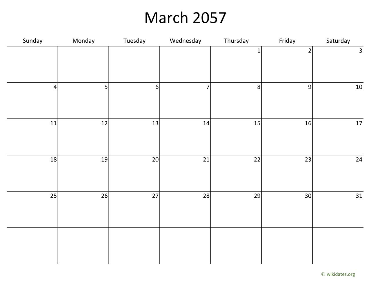 March 2057 Calendar with Bigger boxes make it easier to write in and scan your schedule. You can print full-page calendar with US holidays, week starts on Sunday, landscape/horizontal orientation.