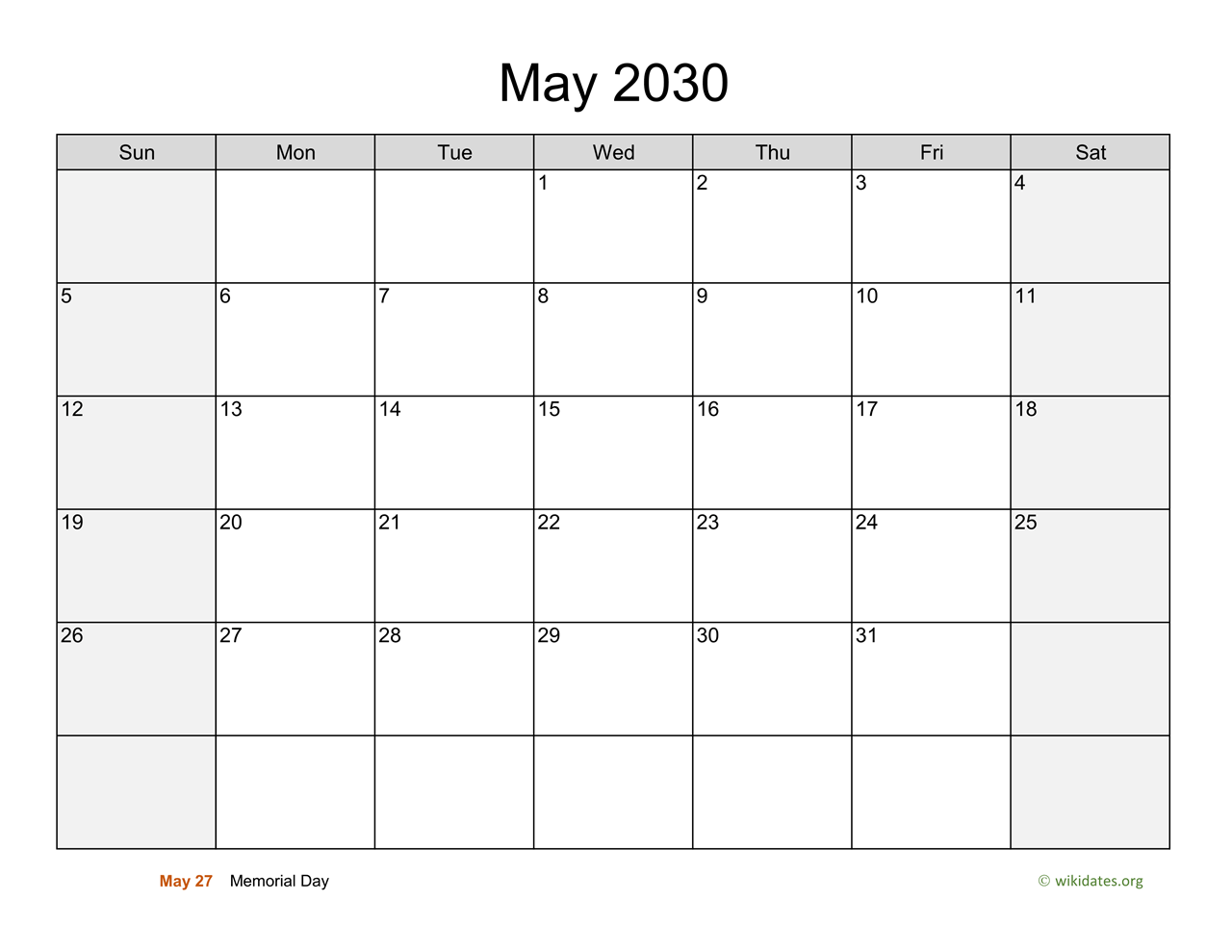 May 2030 Calendar with Saturday and Sunday are shaded in light gray, this template lets you include your schedule, events, notes, to-do list and holidays.