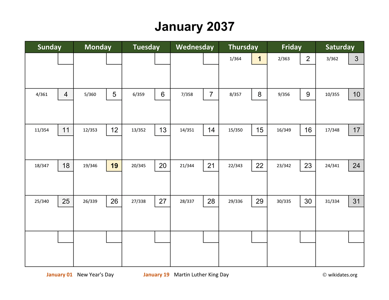 Monthly 2037 calendar with day numbers, 12 months calendar on 12 pages, including US federal holidays, available in PDF file format, landscape/horizontal orientation, free for print or download.