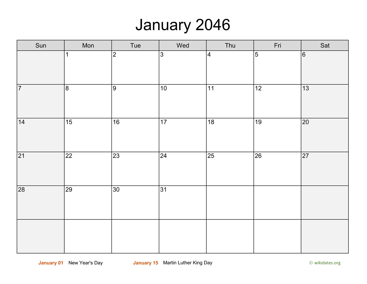 Monthly 2046 Calendar with Saturday and Sunday are shaded in light gray, this template lets you include your schedule, events, notes, to-do list and holidays.
