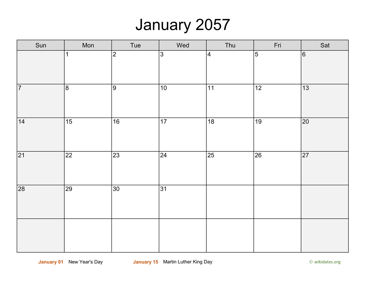 Monthly 2057 Calendar with Saturday and Sunday are shaded in light gray, this template lets you include your schedule, events, notes, to-do list and holidays.