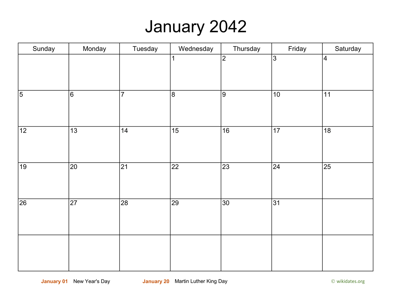 This is a basic, 12 pages monthly calendar for 2042. You can download or print 2042 calendar with your schedule, events and federal holidays included.