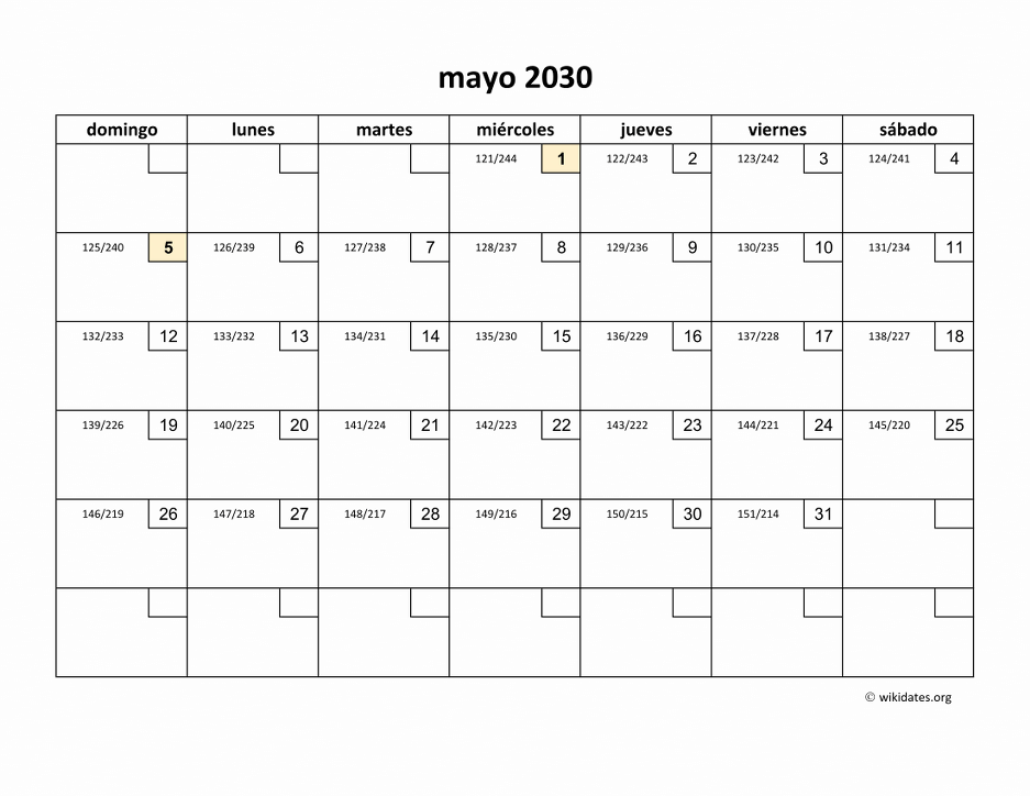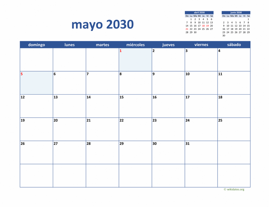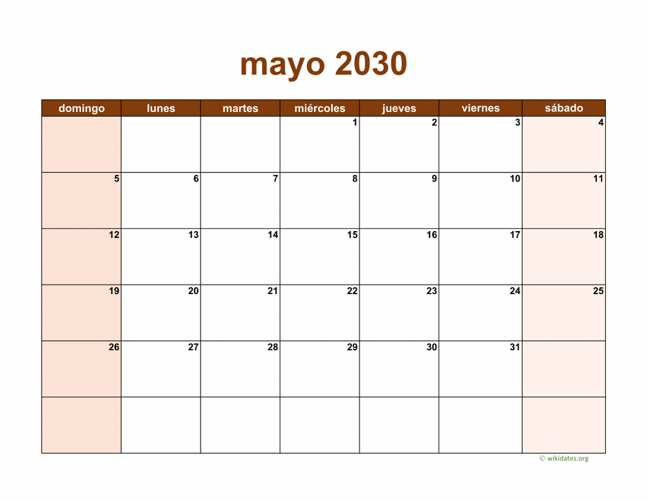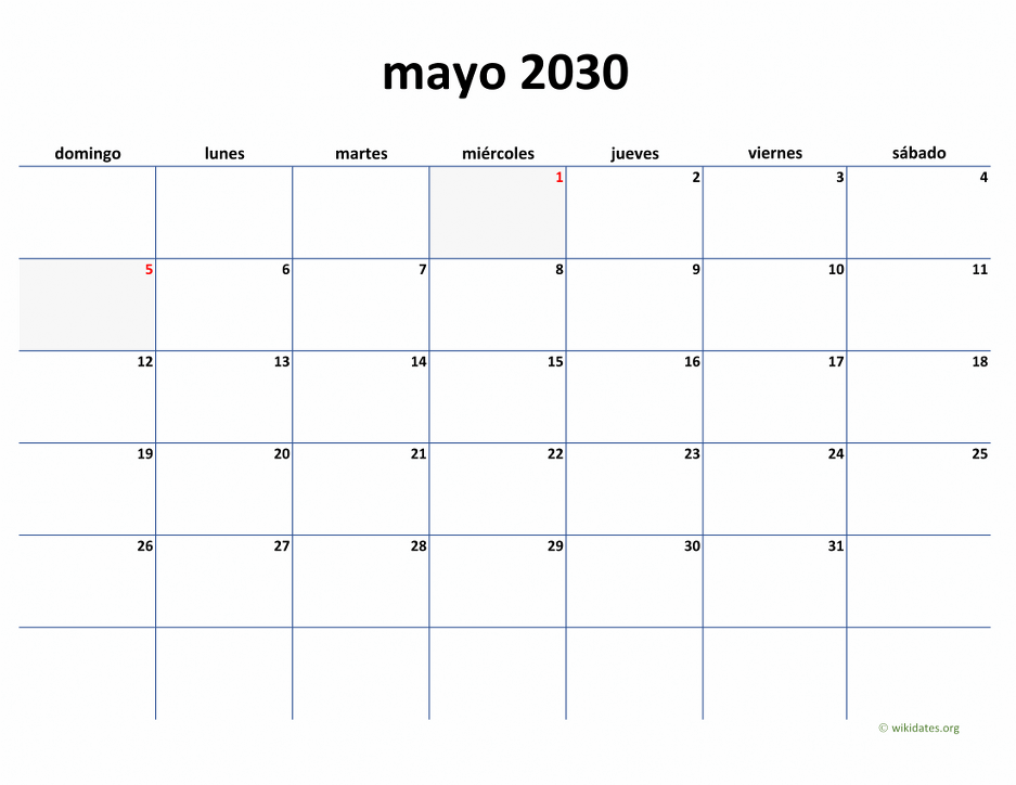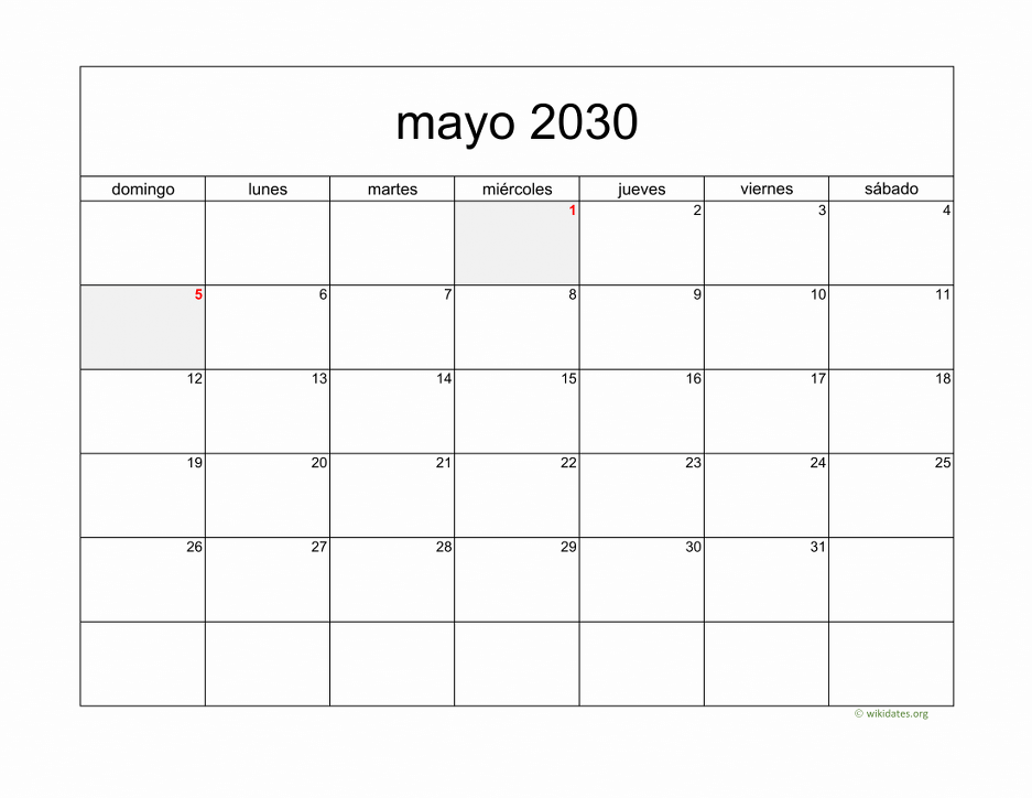 Calendario mayo 2030 gratis