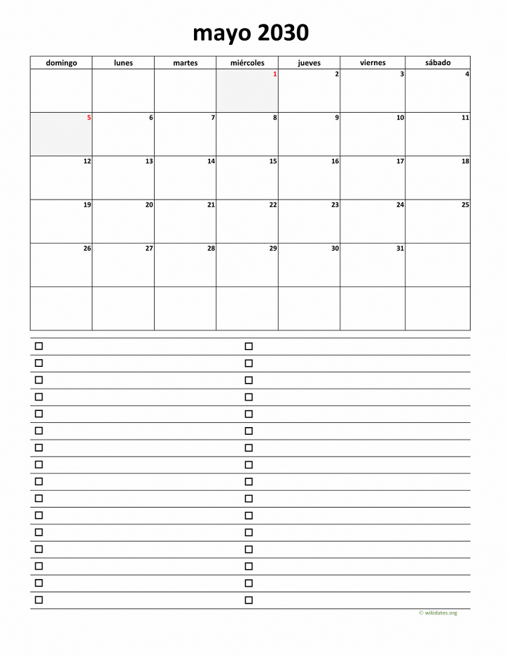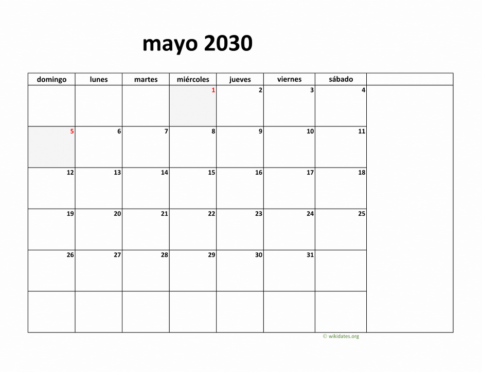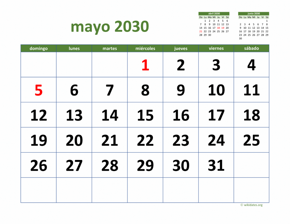 • Calendario Mayo 2030 con los días festivos, gratis, para imprimir.