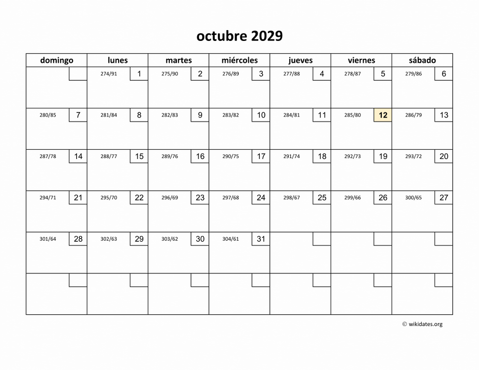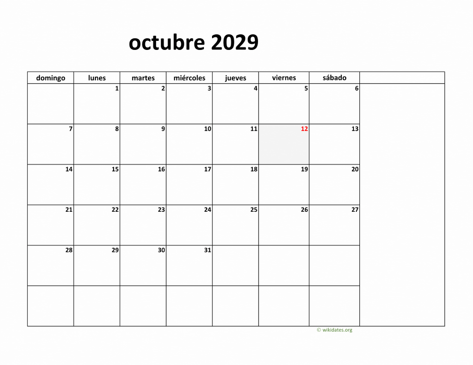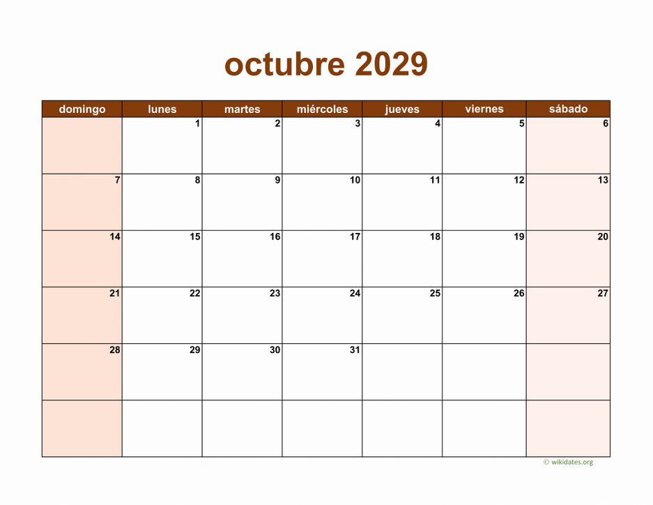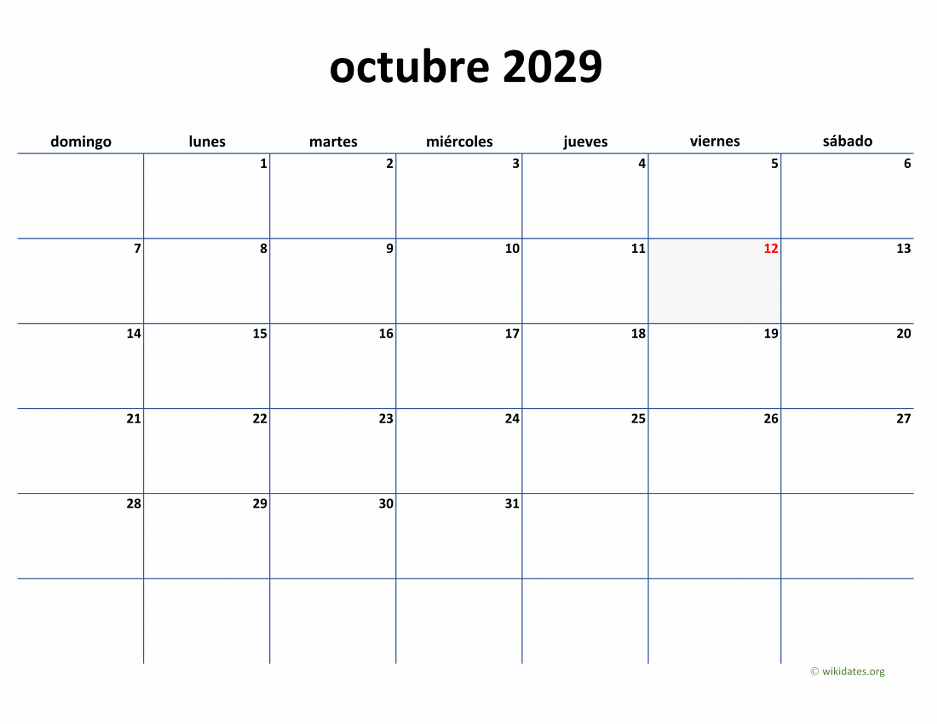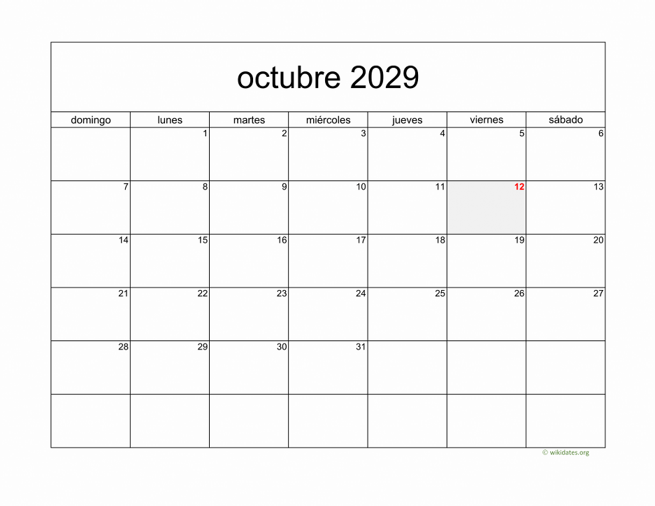 Calendario octubre 2029 gratis