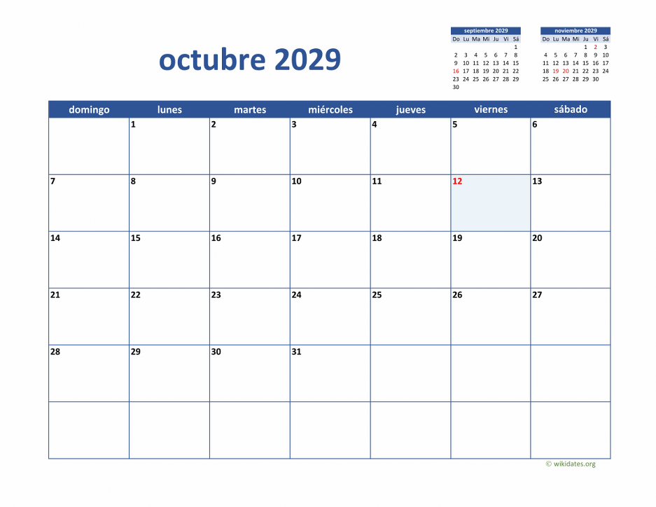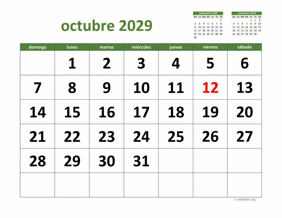• Calendario Octubre 2029 con los días festivos, gratis, para imprimir.
