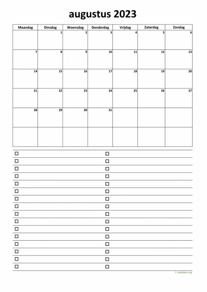 • Maandkalender Augustus 2023 Niederlande Auch für Druck und Download im MS Word (.docx), MS Excel (.xlsx), PDF und JPG-Format.