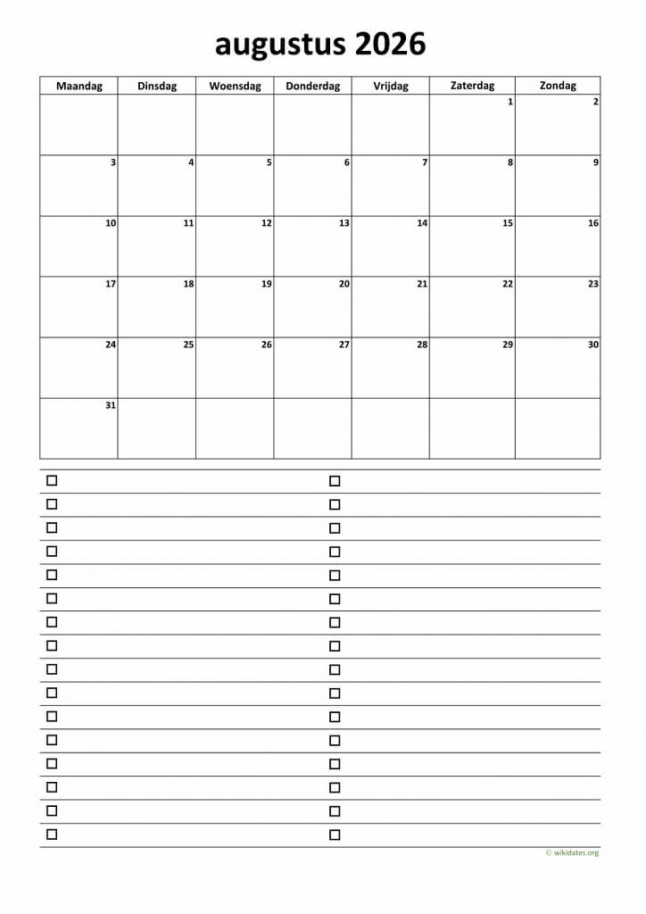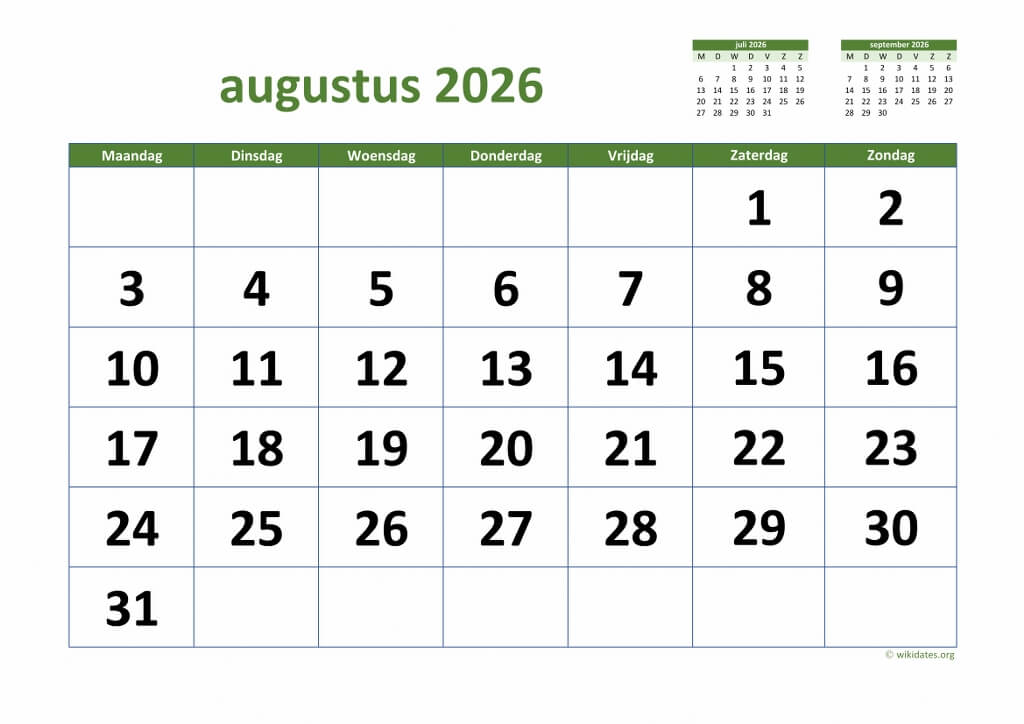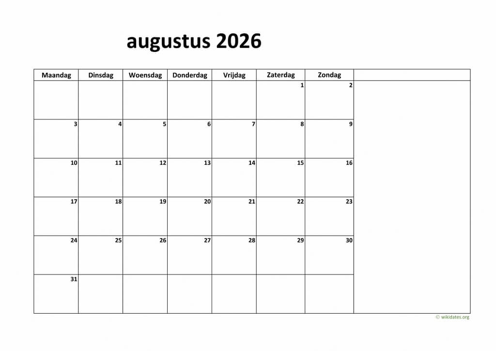 • Maandkalender Augustus 2026 Niederlande Auch für Druck und Download im MS Word (.docx), MS Excel (.xlsx), PDF und JPG-Format.