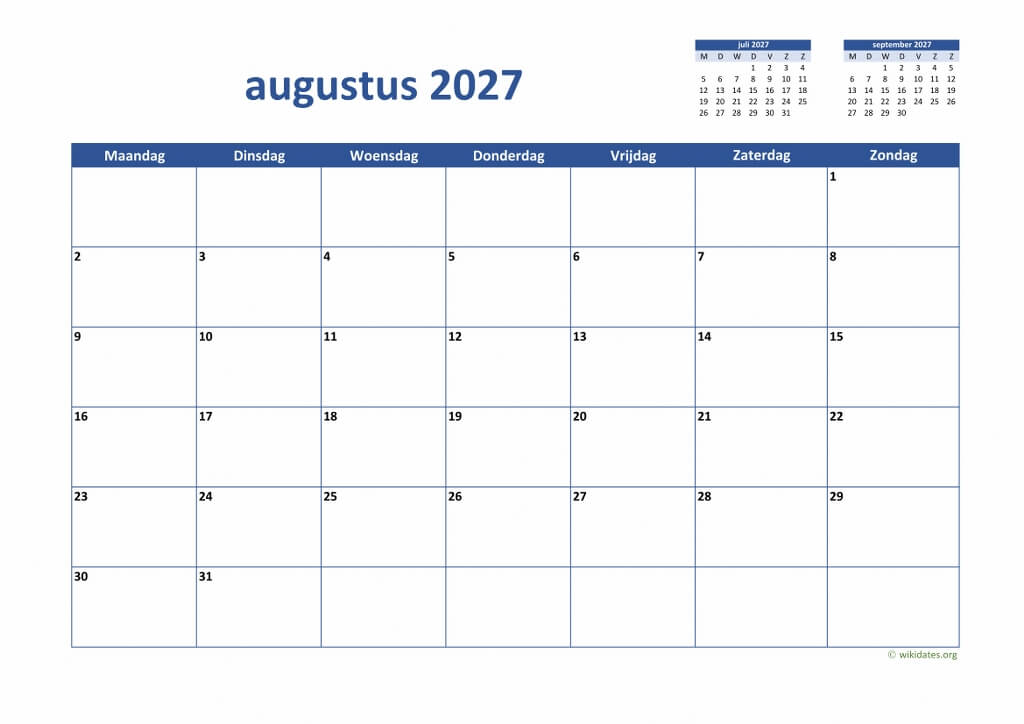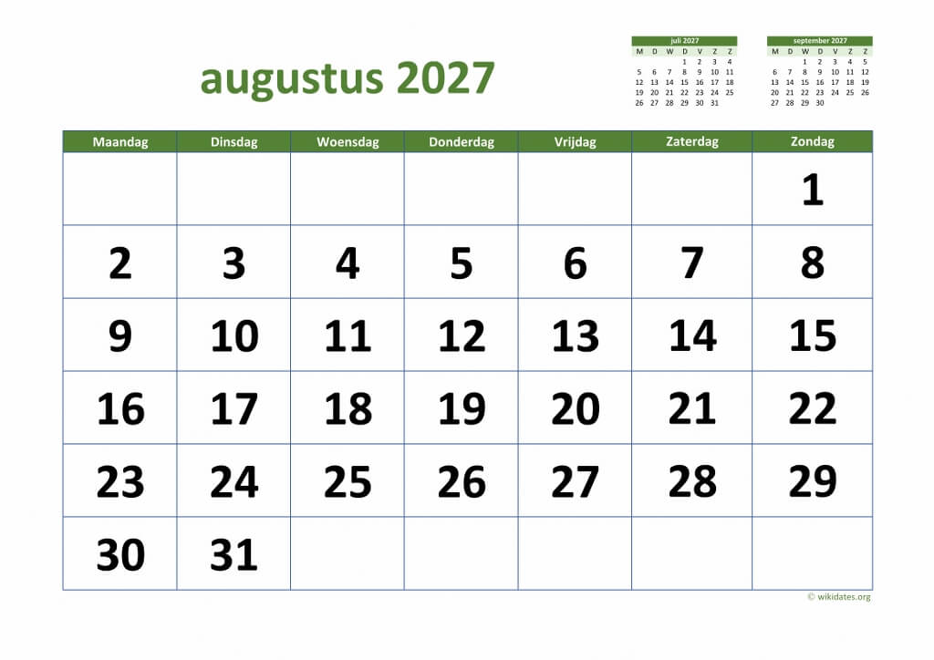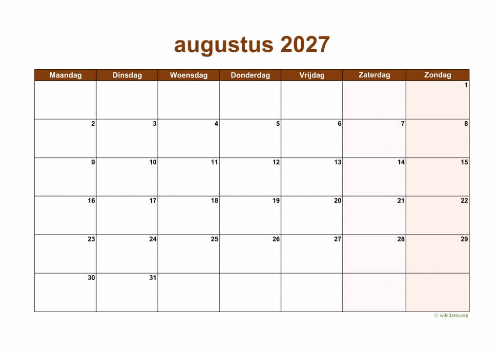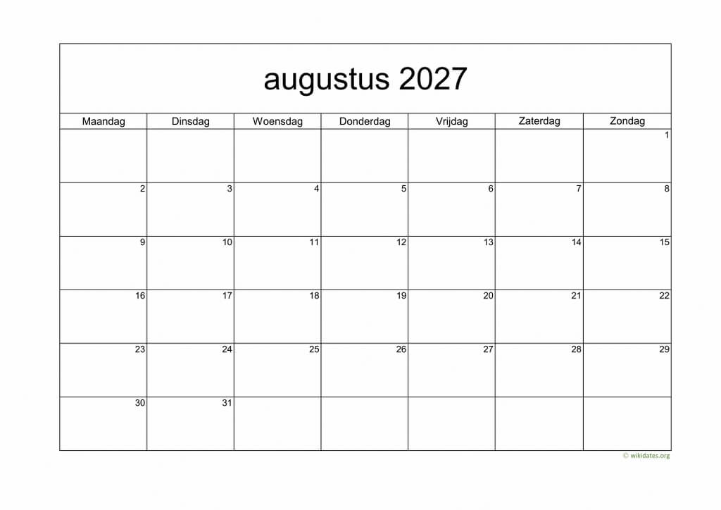 • Maandkalender Augustus 2027 Niederlande Auch für Druck und Download im MS Word (.docx), MS Excel (.xlsx), PDF und JPG-Format.