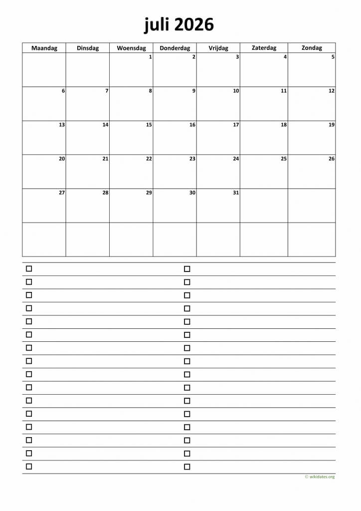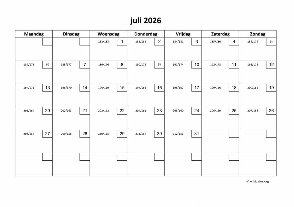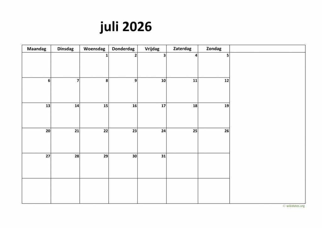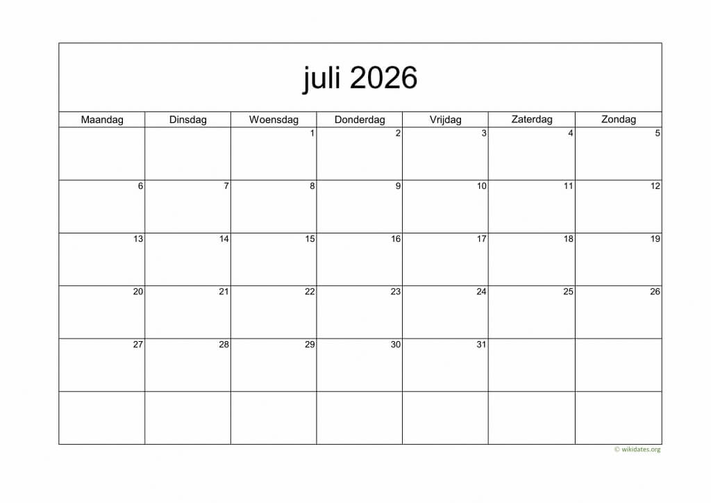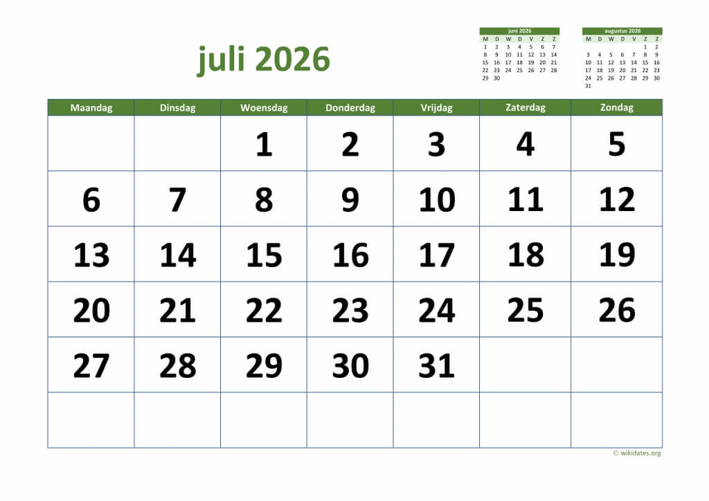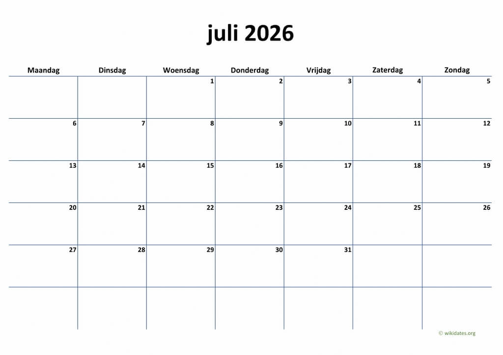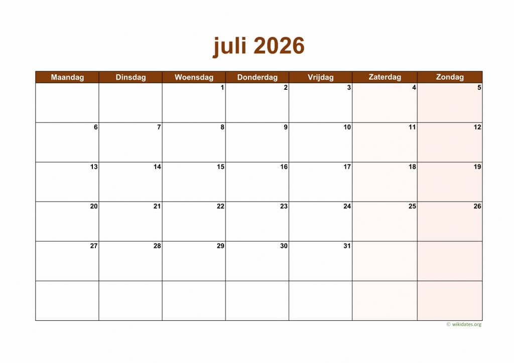 • Maandkalender Juli 2026 Niederlande Auch für Druck und Download im MS Word (.docx), MS Excel (.xlsx), PDF und JPG-Format.