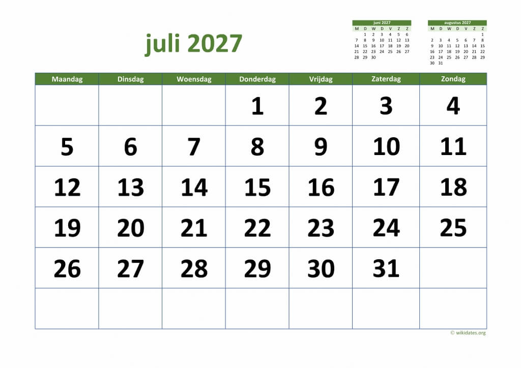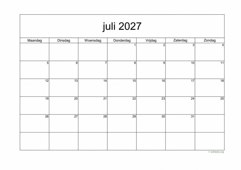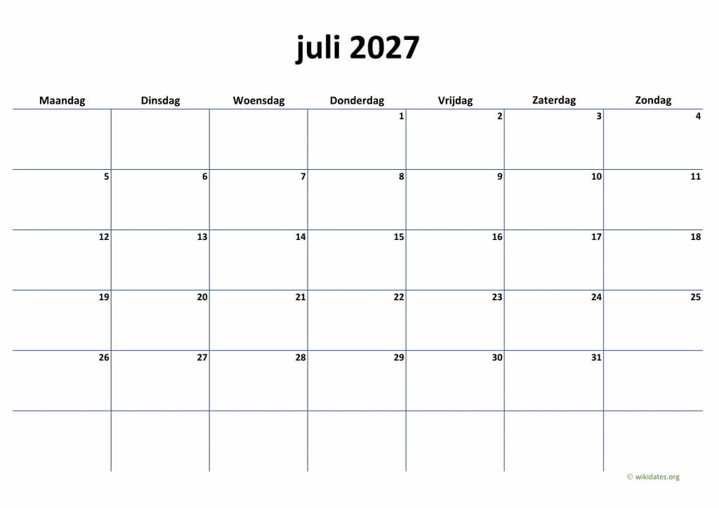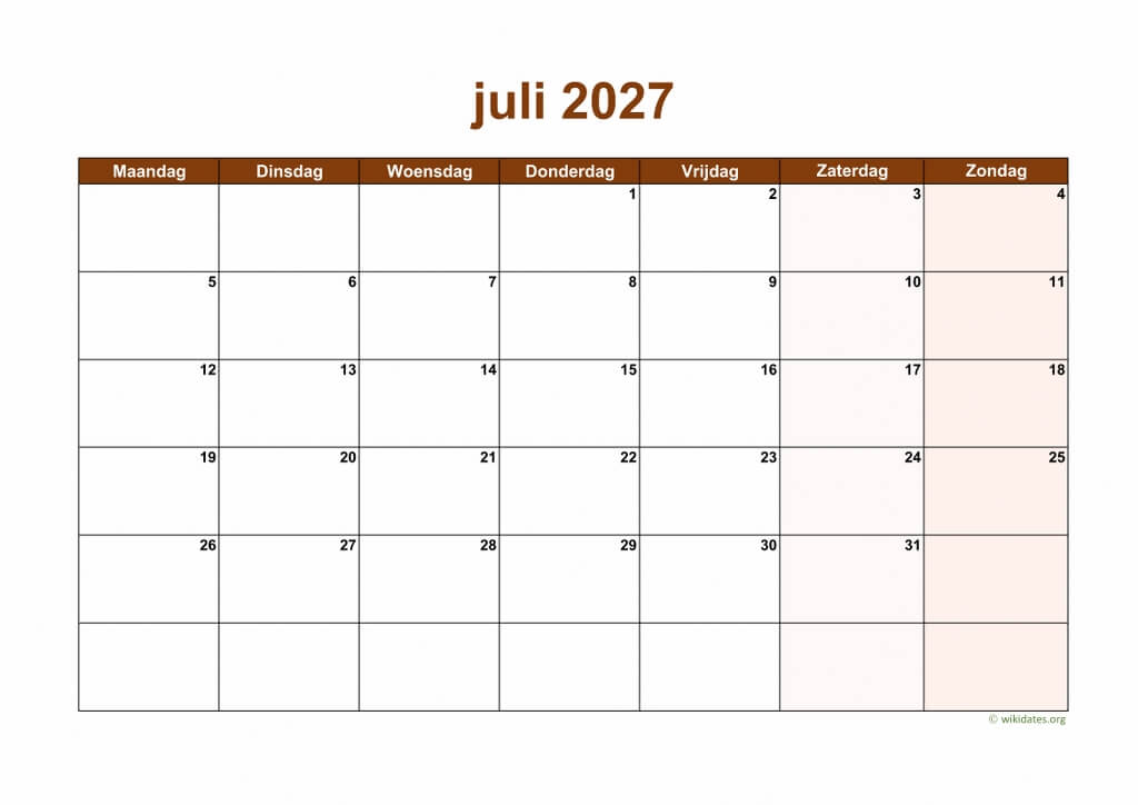 • Maandkalender Juli 2027 Niederlande Auch für Druck und Download im MS Word (.docx), MS Excel (.xlsx), PDF und JPG-Format.