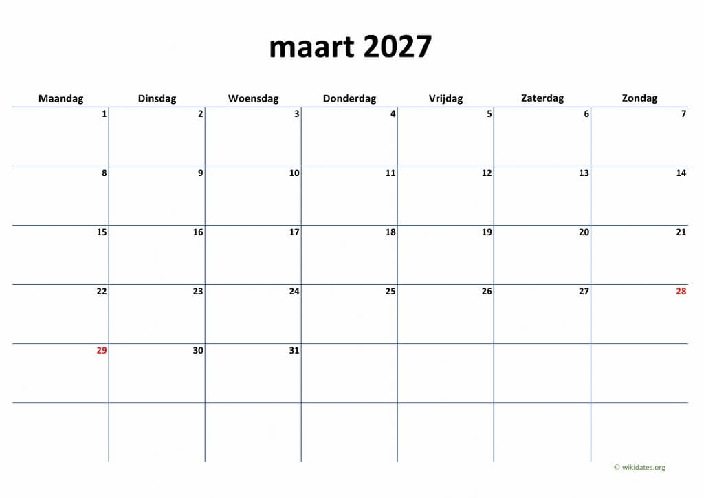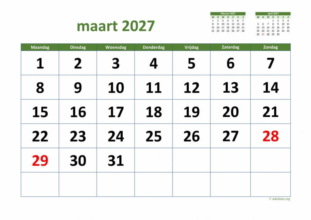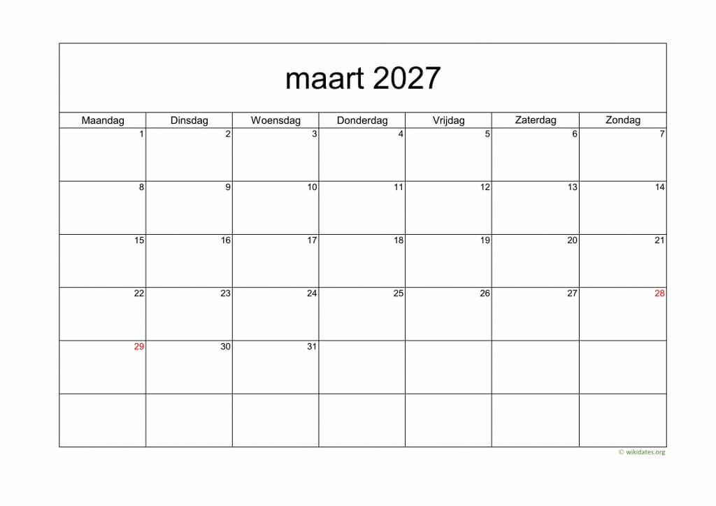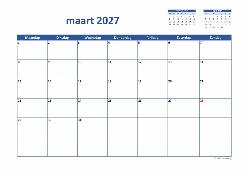 • Maandkalender Maart 2027 Niederlande Auch für Druck und Download im MS Word (.docx), MS Excel (.xlsx), PDF und JPG-Format.