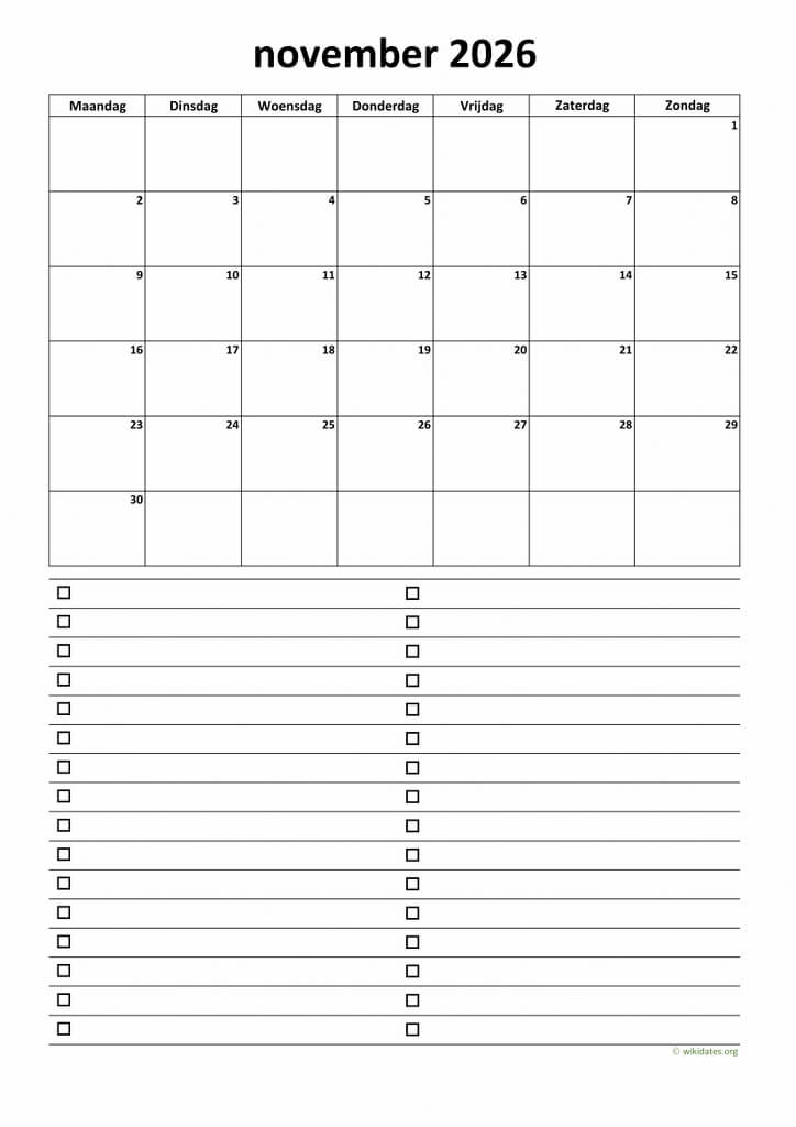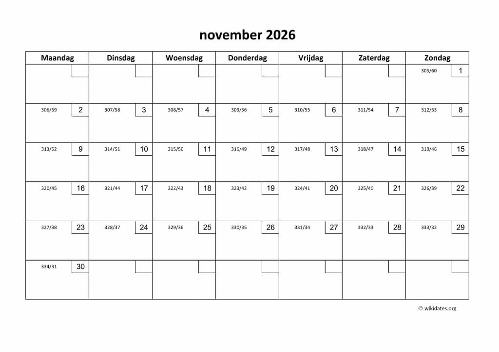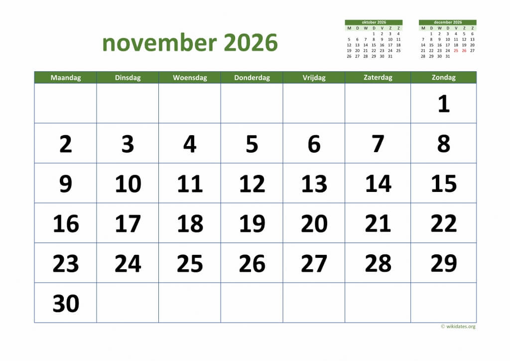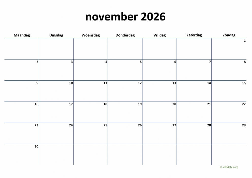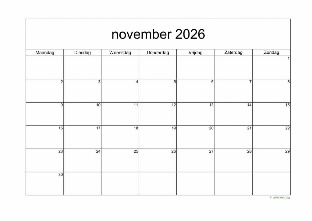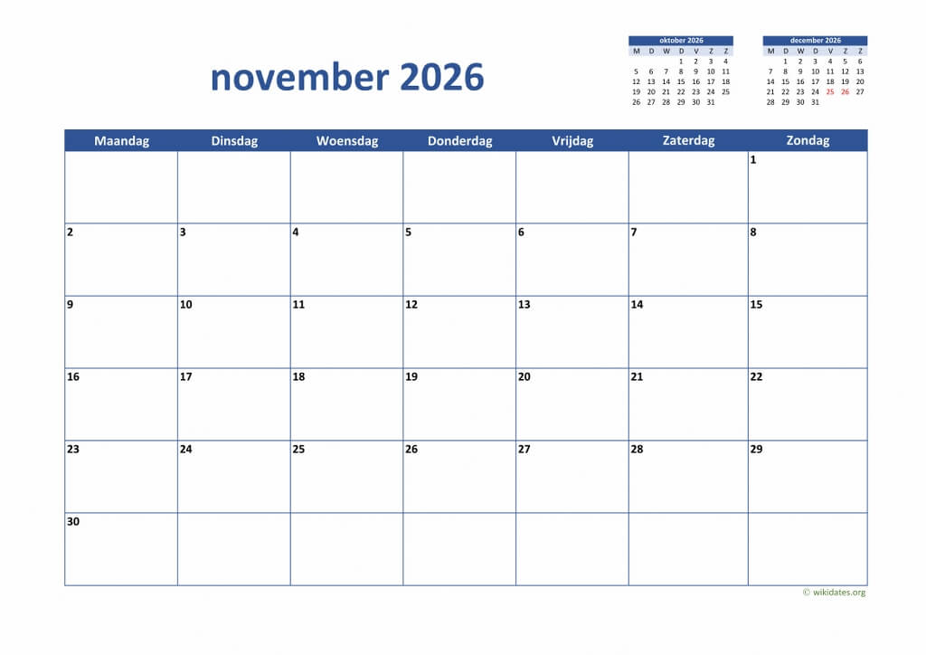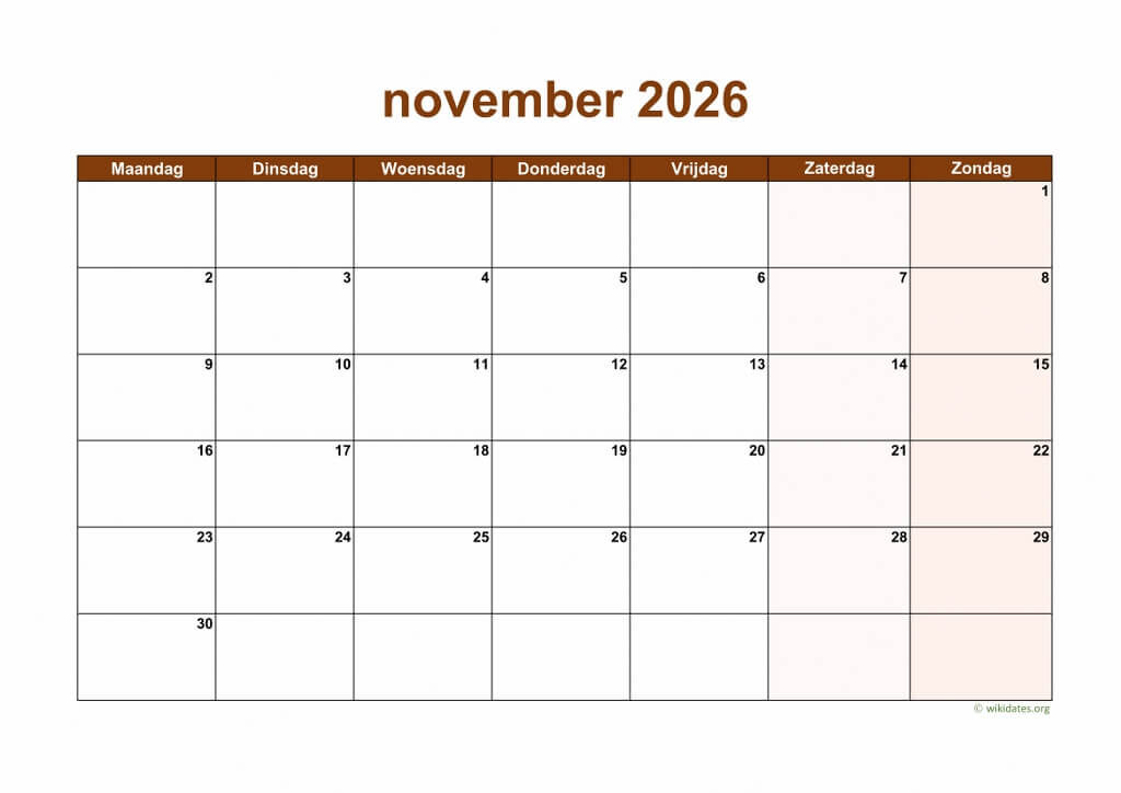 • Maandkalender November 2026 Niederlande Auch für Druck und Download im MS Word (.docx), MS Excel (.xlsx), PDF und JPG-Format.