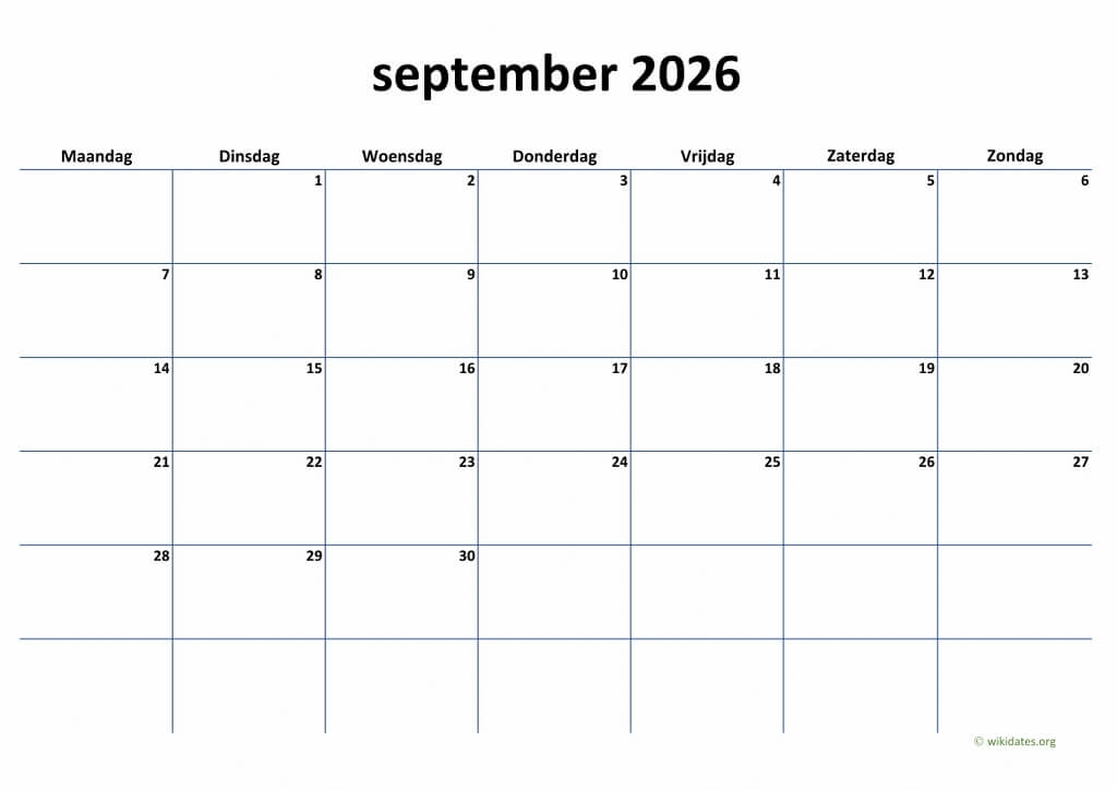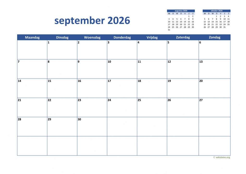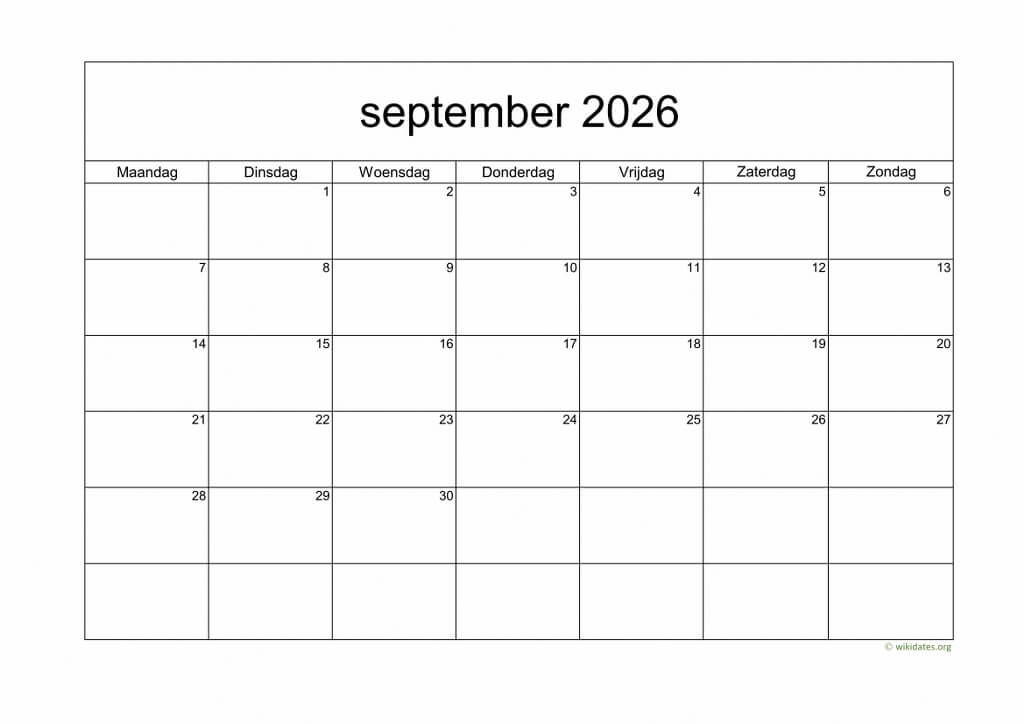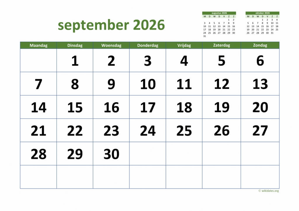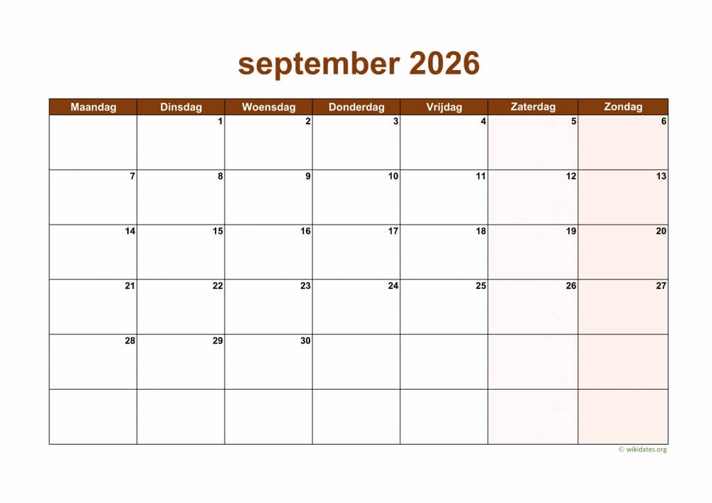 • Maandkalender September 2026 Niederlande Auch für Druck und Download im MS Word (.docx), MS Excel (.xlsx), PDF und JPG-Format.