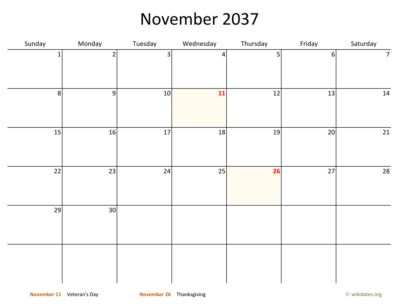 November 2037 Calendar with Bigger boxes make it easier to write in and scan your schedule. You can print full-page calendar with US holidays, week starts on Sunday, landscape/horizontal orientation.