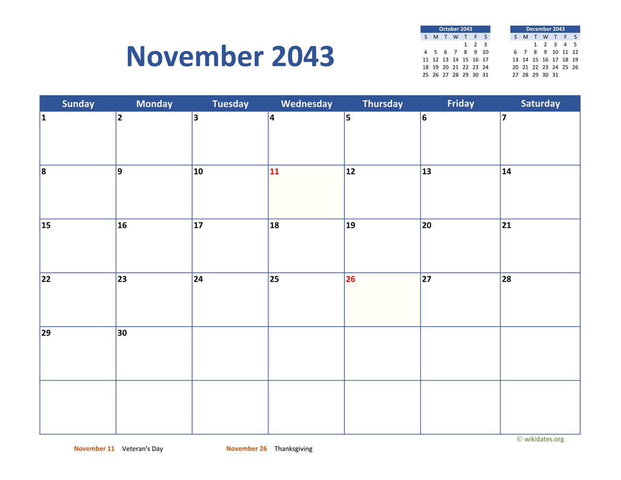 November 2043 calendar classic design with a view of the previous and next months, including federal holidays, letter paper size, week starts on Sunday, landscape/horizontal format.