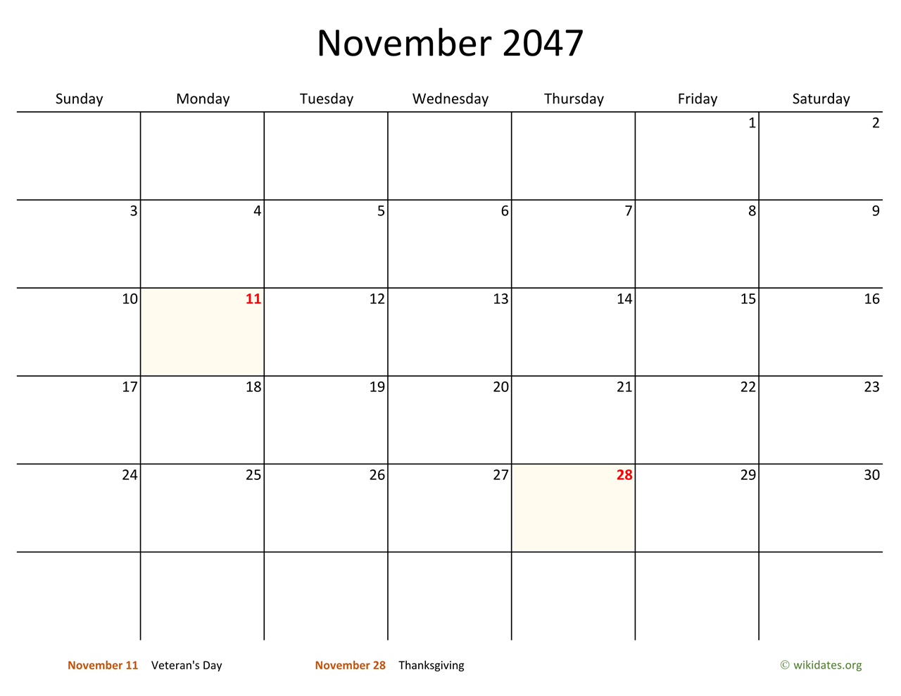 November 2047 Calendar with Bigger boxes make it easier to write in and scan your schedule. You can print full-page calendar with US holidays, week starts on Sunday, landscape/horizontal orientation.