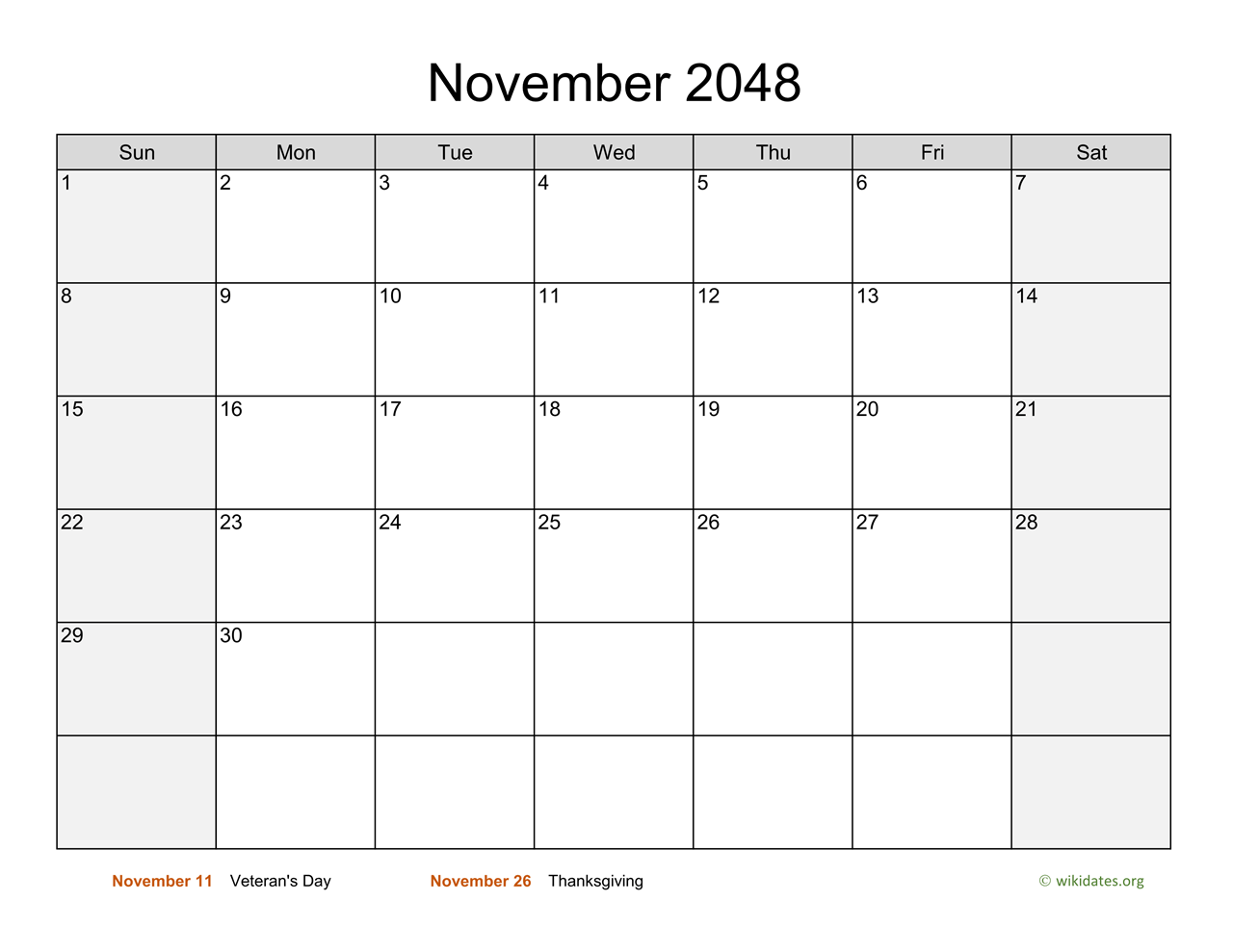 November 2048 Calendar with Saturday and Sunday are shaded in light gray, this template lets you include your schedule, events, notes, to-do list and holidays.