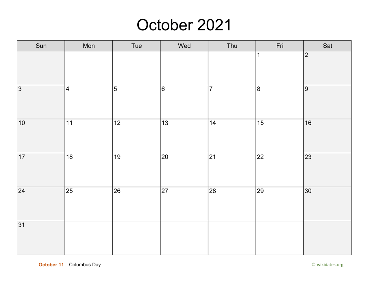October 2021 Calendar with Saturday and Sunday are shaded in light gray, this template lets you include your schedule, events, notes, to-do list and holidays.