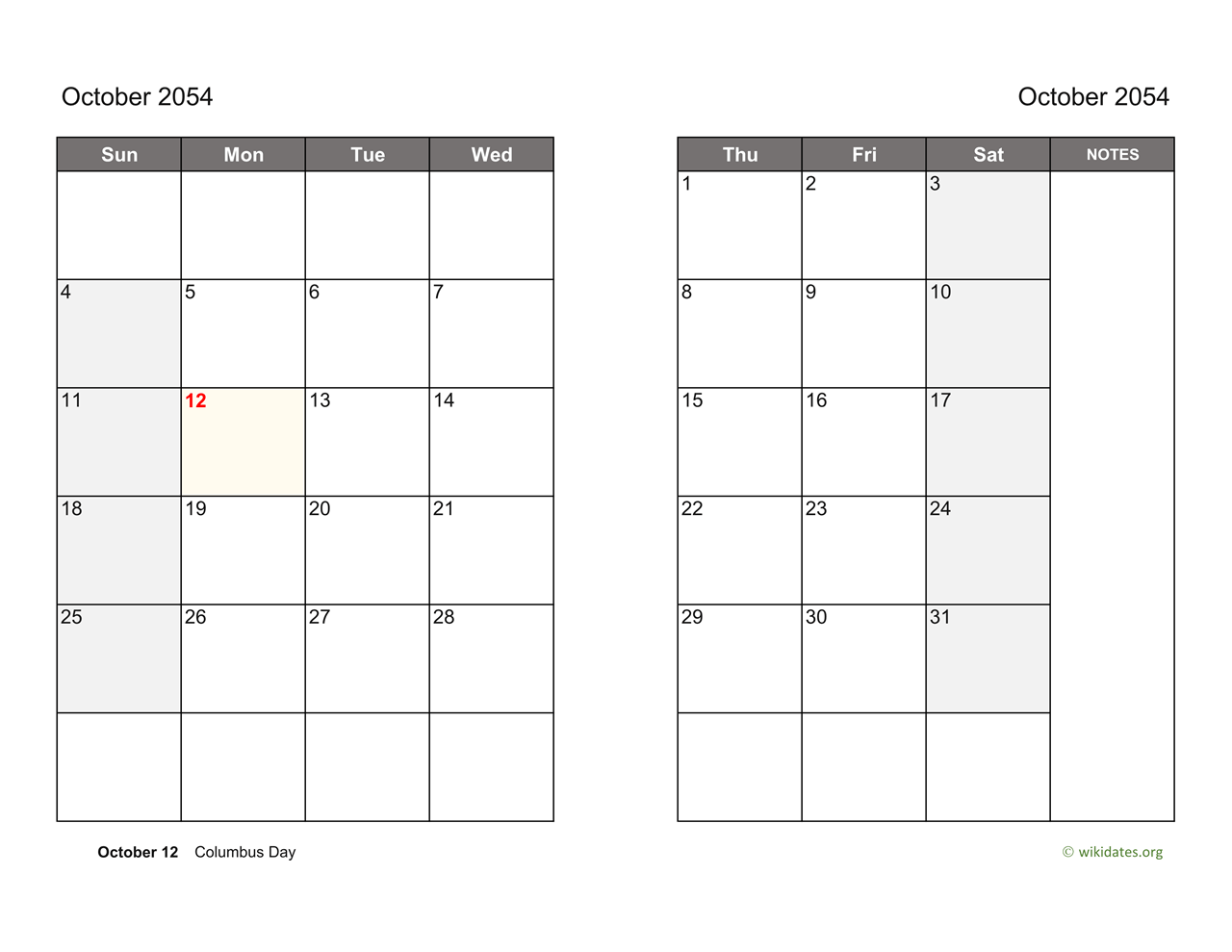 October 2054 Calendar spread across two pages and a column for notes. This calendar template lets you create calendar for october 2054 split across 2 pages with your schedule, events, notes and holidays included, download or print double-sided refills for your planner/organizer.