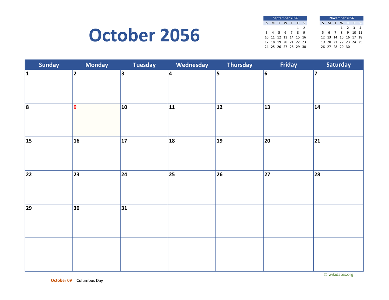 October 2056 calendar classic design with a view of the previous and next months, including federal holidays, letter paper size, week starts on Sunday, landscape/horizontal format.